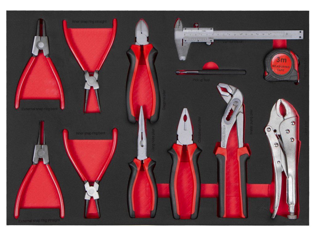 | 9 ks | Kleště: na pojistné kroužky (rovné, zahnuté, vnitřní, vnější), kombinované, prodloužené, štípací, SIKO kleště a samosvorné kleště |