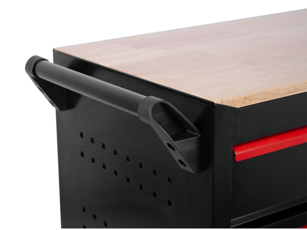 Dílenský vozík má velkou pracovní plochu v podobě dřevěné desky, kterou lze využít při práci jako menší pracovní stůl.