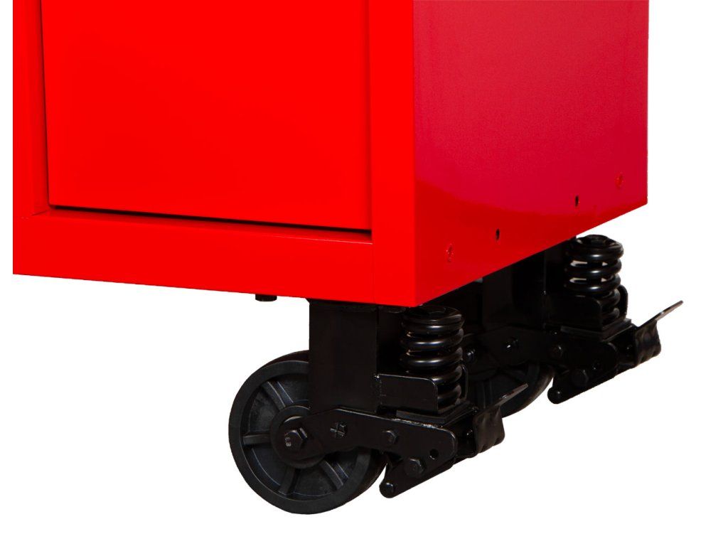 Vozík je postaven na stabilním pojezdovém podvozku s velkými 6" kolečky, která zlepšují manipulaci po dílenské podlaze a usnadňují přesuny mezi pracovišti i při plném zatížení.