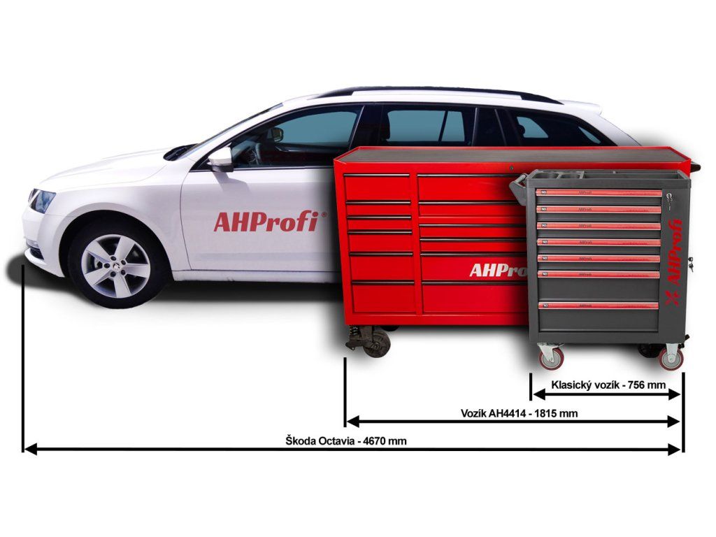 - Největší vozík v nabídce AHProfi – rozměry 1815 × 559 × 1114 mm.