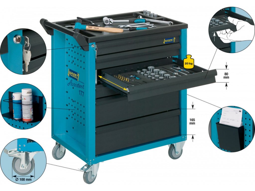 Vysoce kvalitní, pojízdný montážní vozík HAZET, nosnost 300 kg, 6 zásuvek.