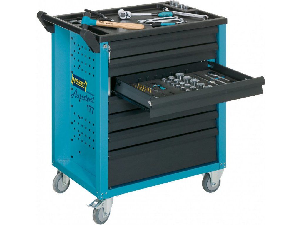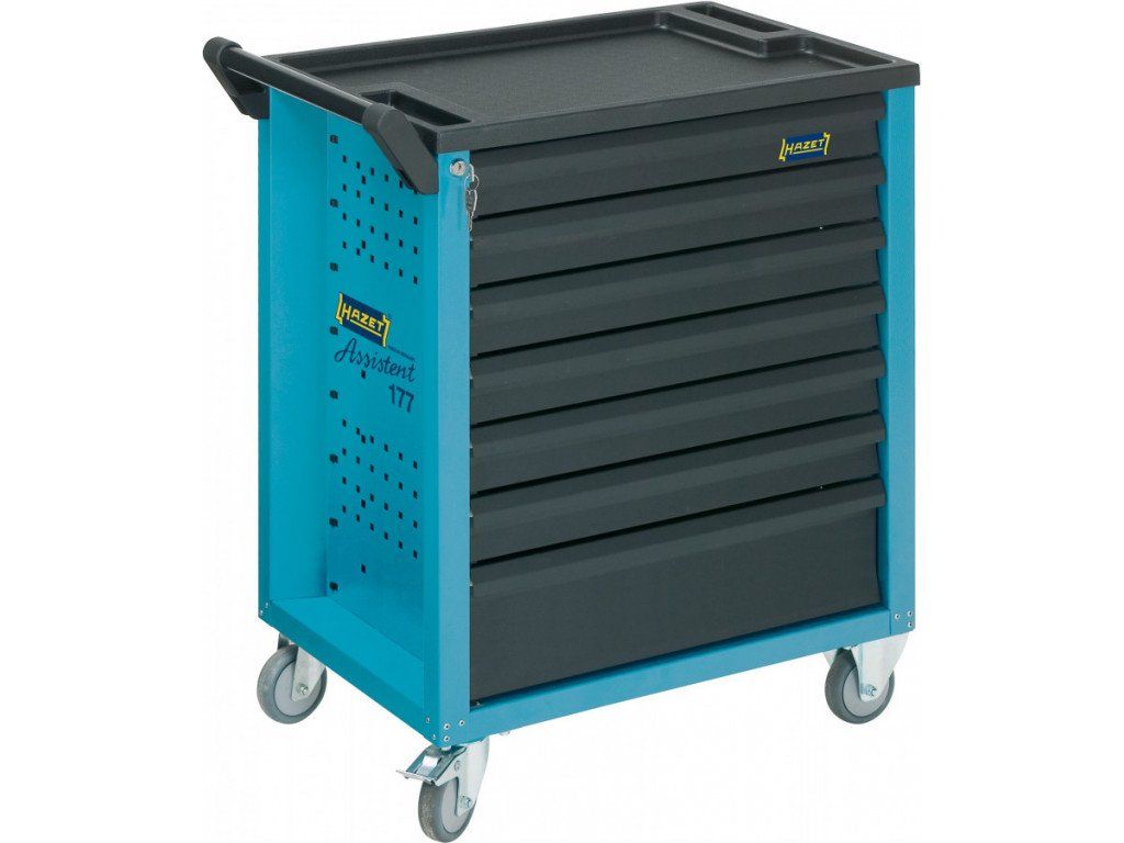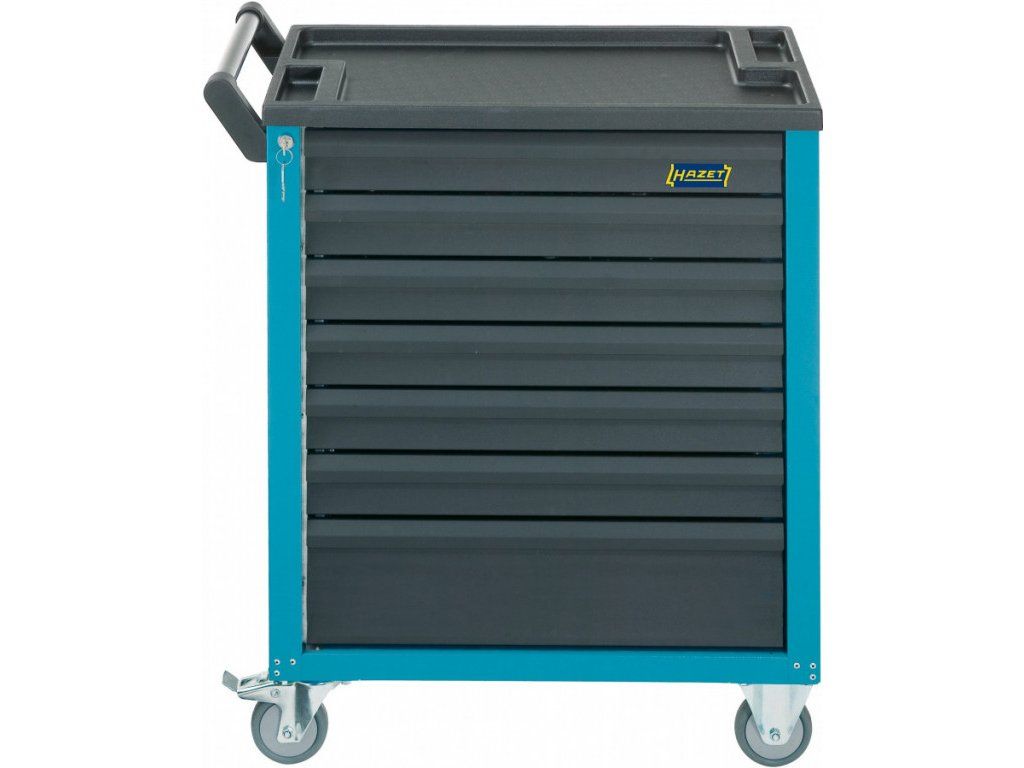 Vysoce kvalitní, pojízdný montážní vozík od německého výrobce HAZET, nosnost 300 kg, centrální zamykání, 7 zásuvek - 6 nižších (80 mm) a 1 vyšší (165 mm).