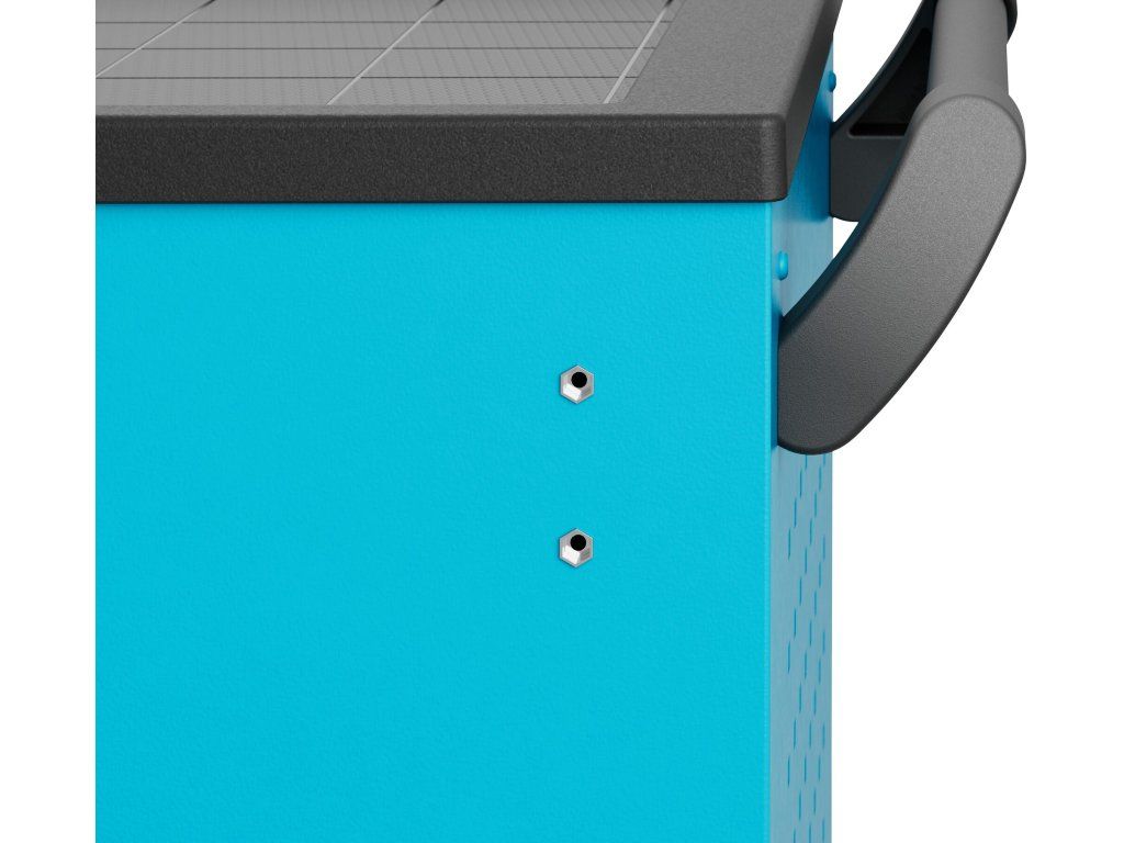 Vozík je vybaven 7 zásuvkami – 5 nízkými a 2 vysokými – s plným 100% výsuvem na kolečkovém vedení. Horní pracovní plocha je opatřena plastovým krytem odolným vůči rozpouštědlům a zvýšeným lemem proti pádu dílů.