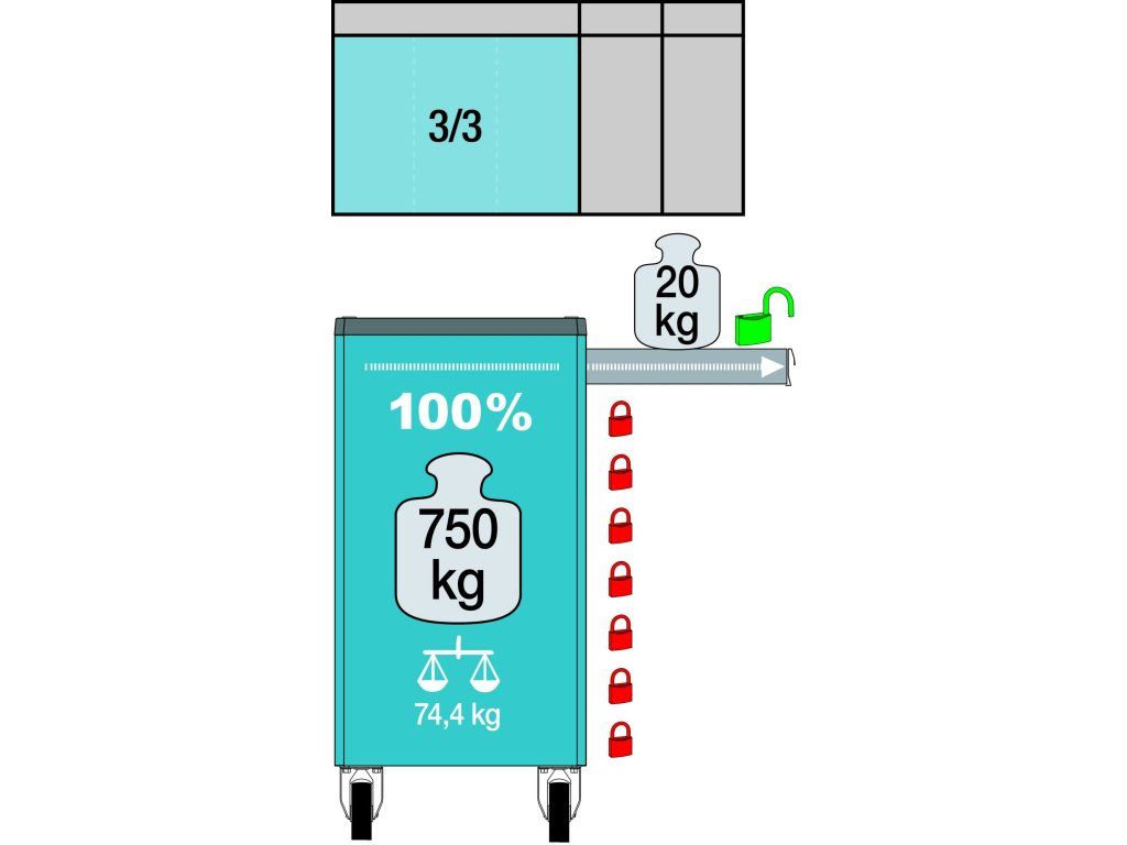 Centrální zamykání s cylindrickým zámkem a vzájemné zajištění zásuvek přispívají k bezpečnému provozu a minimalizují riziko překlopení vozíku.