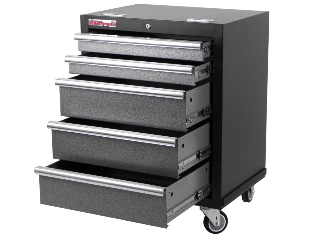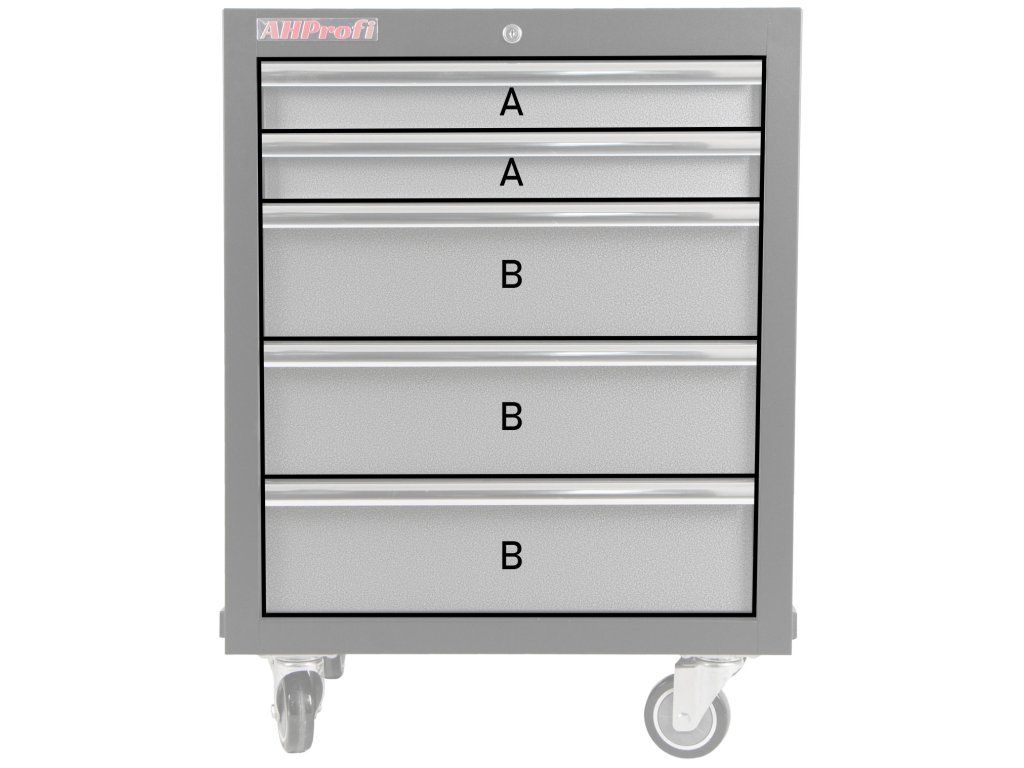 Součástí vozíku je 5 uzamykatelných zásuvek pro uložení výplní dílenského vozíku s ručním nářadím. Zásuvky jsou osazeny kuličkovými ložisky v pojezdech, čímž se zvyšuje jejich nosnost bez vlivu na výbornou vlastnost výjíždění/zajíždění.
