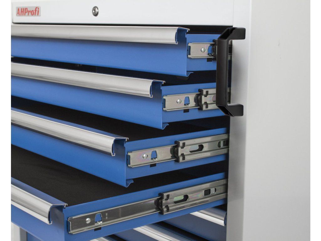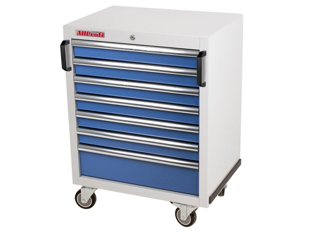 - Disponuje 7 uzamykatelnými zásuvkami pro přehledné uložení nářadí a výplní do vozíků.