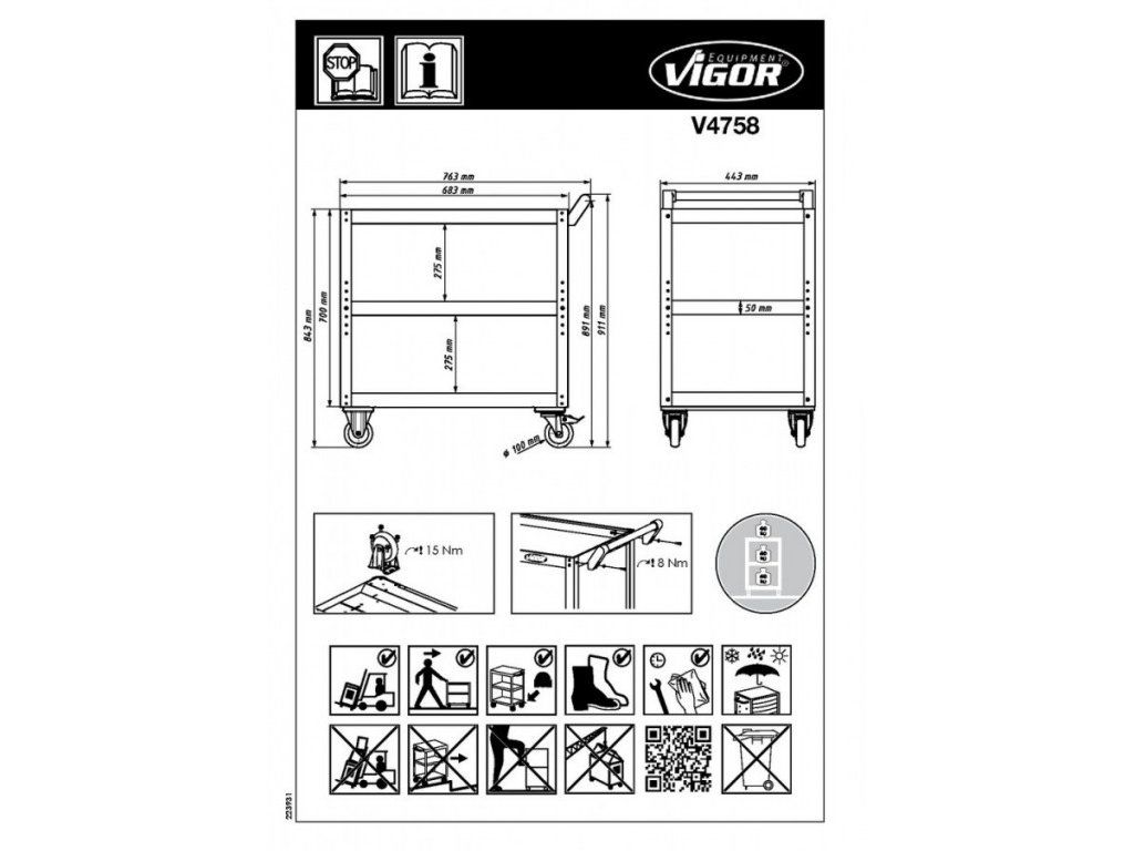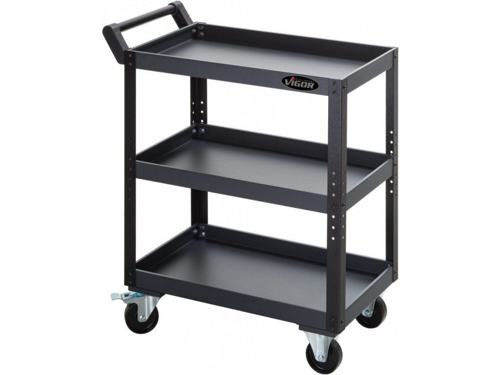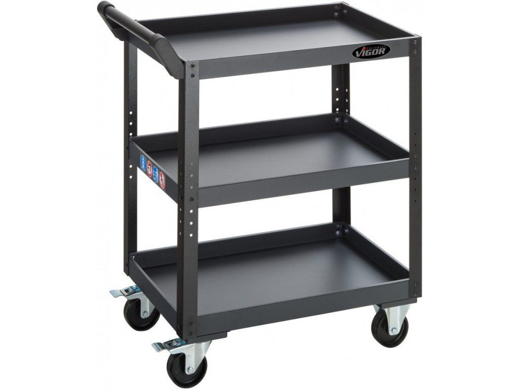 Dílenský (servisní) vozík na nářadí VIGOR. Stabilní konstrukce z ocelového plechu (50 mm tloušťka).