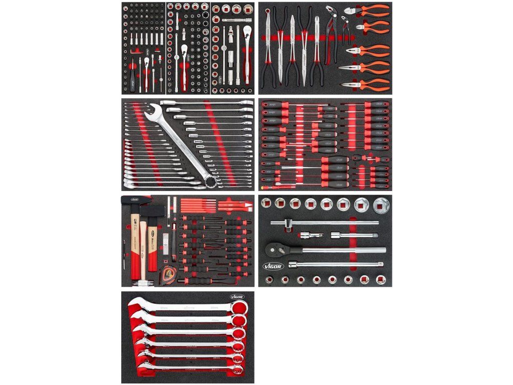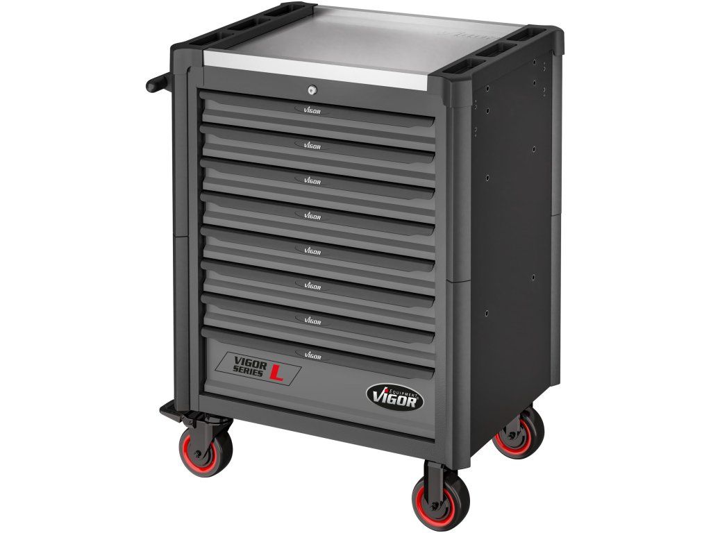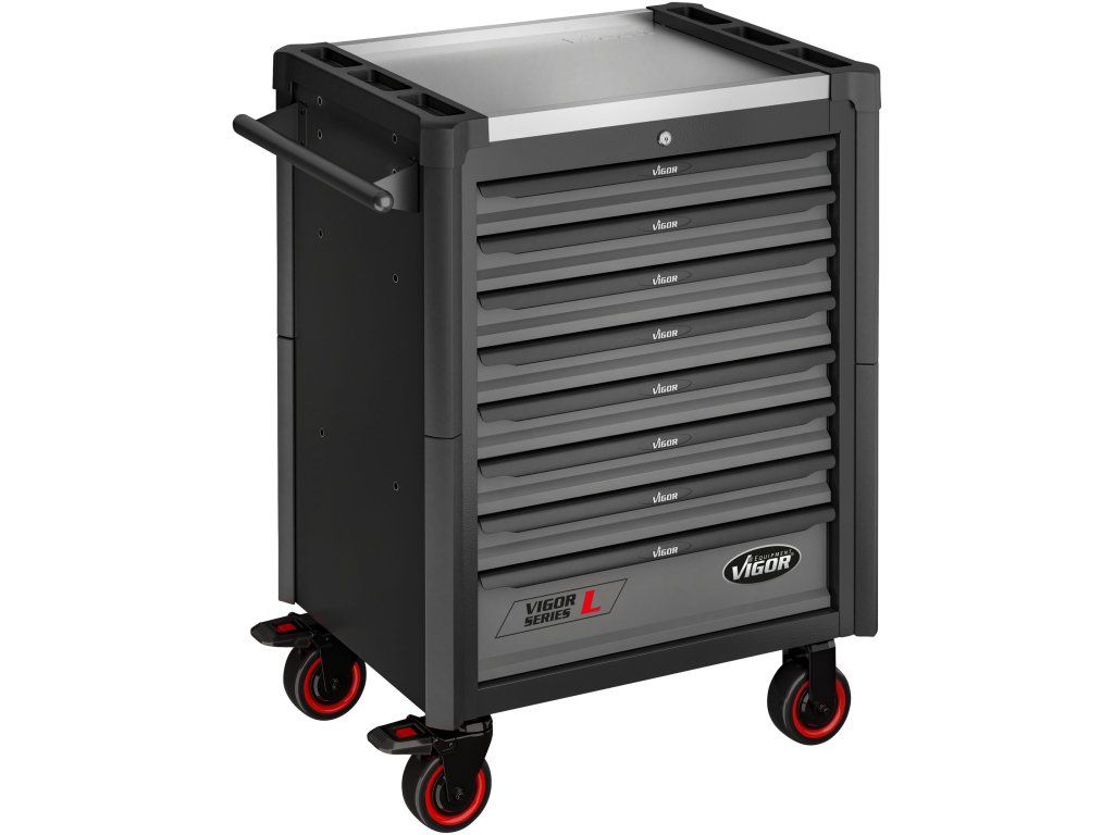 Vozík je vybaven 8 zásuvkami s 100% výsuvem, vzájemným blokováním a centrálním zamykáním. Součástí je 298 ks profesionálního nářadí VIGOR, vhodného pro údržbu a opravy nákladních automobilů.