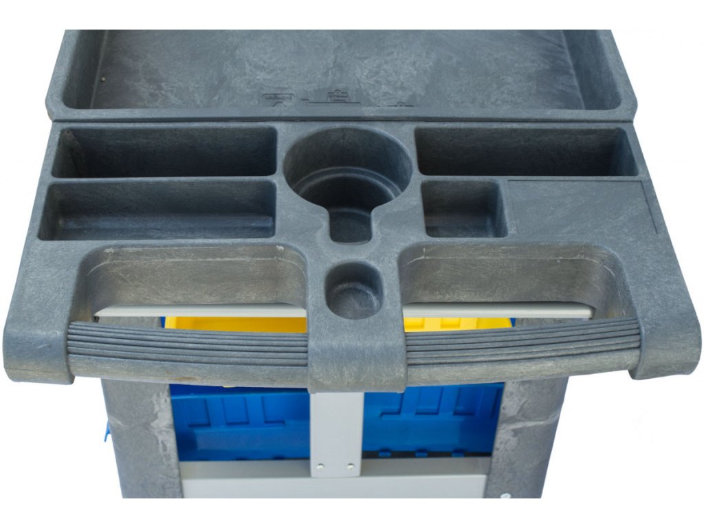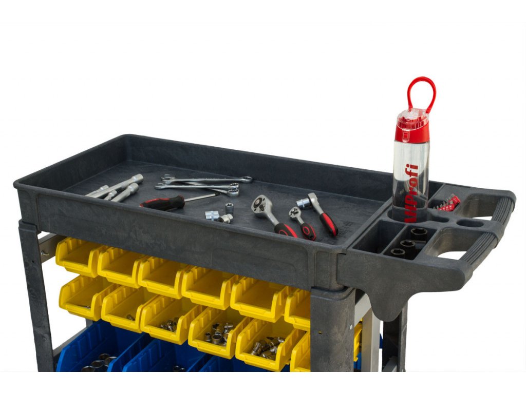 Úložný prostor dále doplňuje spodní vana a vrchní pracovní deska s prolisy pro uložení právě používaného nářadí. Celková nosnost vozíku činí 227 kg.
