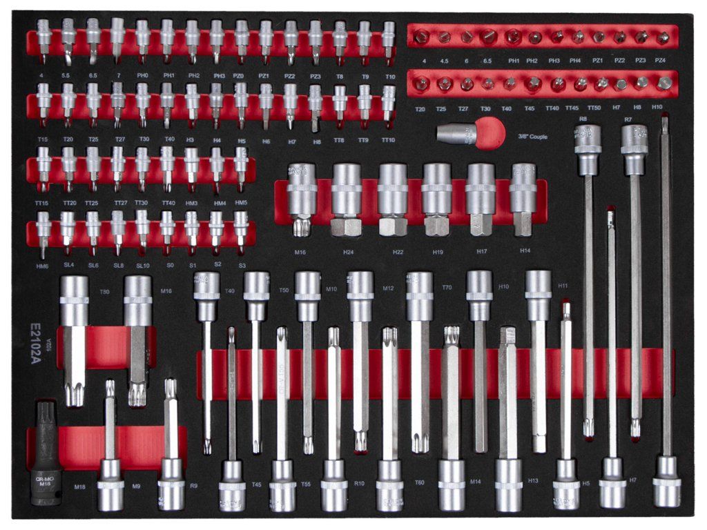| 48 ks | Hlavice s bity (37 mm): Křížové: PH0, PH1, PH2, PH3, PZ0, PZ1, PZ2, PZ3 Ploché: 4, 5.5, 6.5, 7 mm Torx: T8, T9, T10, T15, T20, T25, T27, T30, T40, TT8, TT9, TT10, TT15, TT20, TT25, TT27, TT30, TT40, TS10, TS15, TS20, TS25, TS27, TS30, TS40, TS45, TS50 Imbus: H3, H4, H5, H6, H7, H8 Tisícihran: M8, M10, M12 |