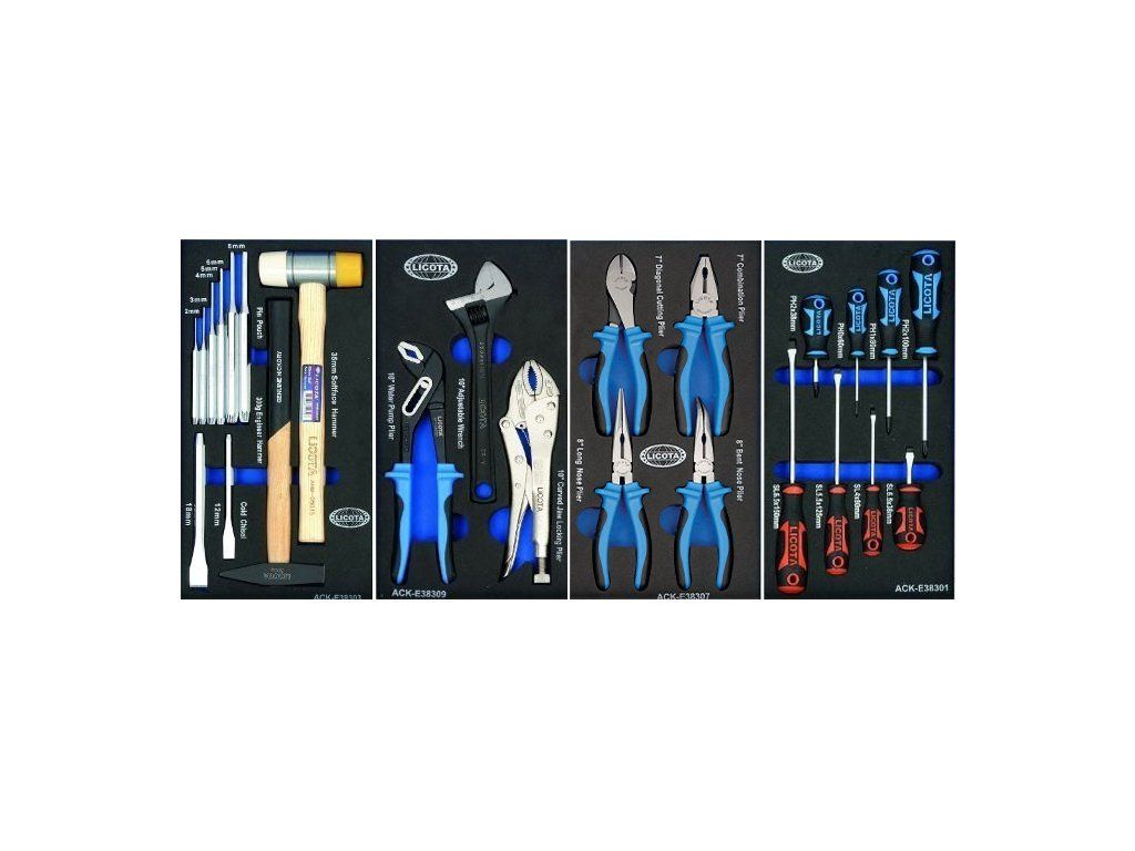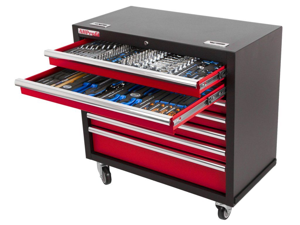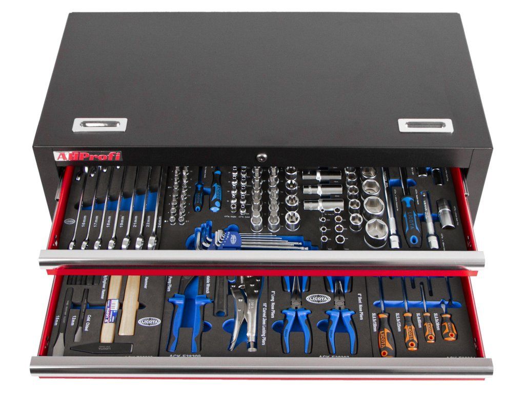 Horní dva šuplíky obsahují výplně s nejpoužívanějším nářadím. Nářadí je uloženo v pěnových výplních ve kterých skvěle drží, na rozdíl od plastové výplně.
