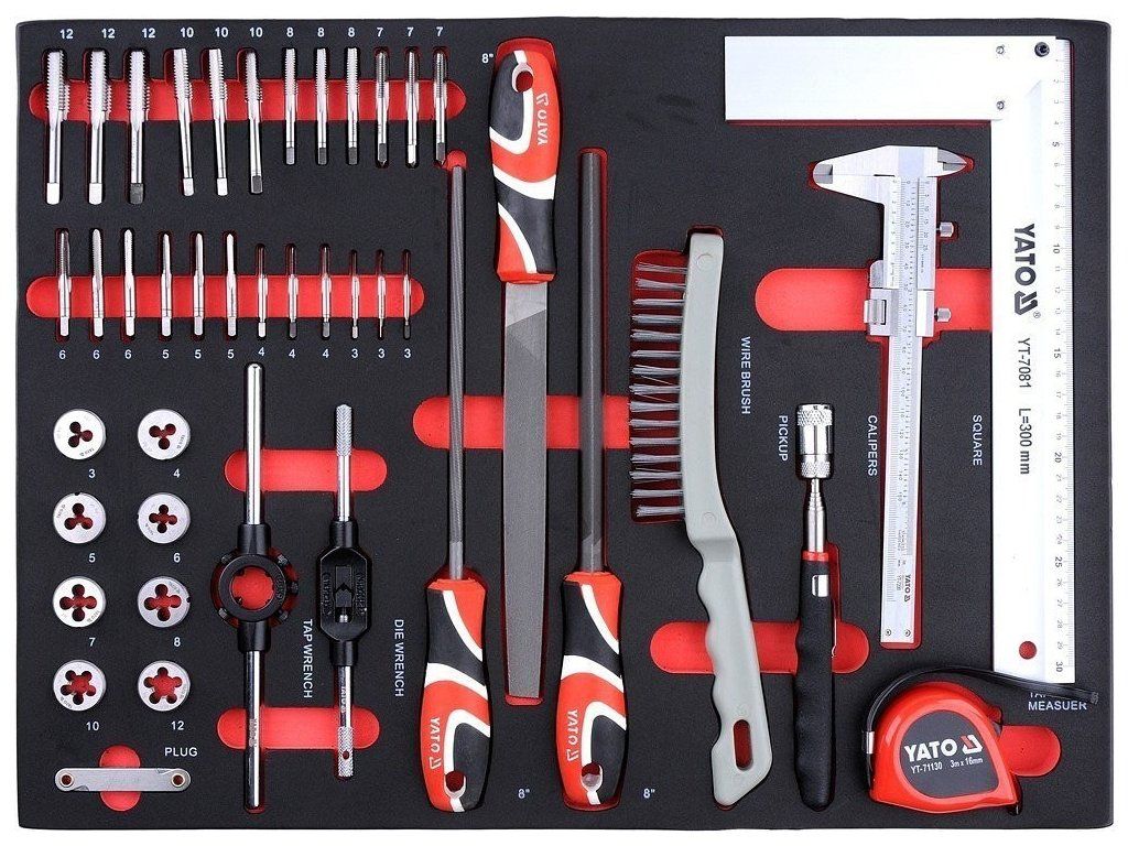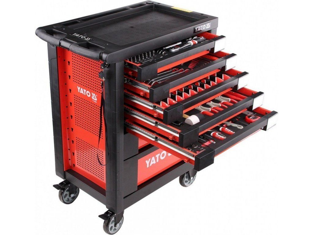 Dílenská skříňka nástrojů značky YATO, vybavena 7 zásuvkami s kuličkovým ložiskem, 5 horních zásuvek obsahuje 211 pečlivě vybraných nástrojů.