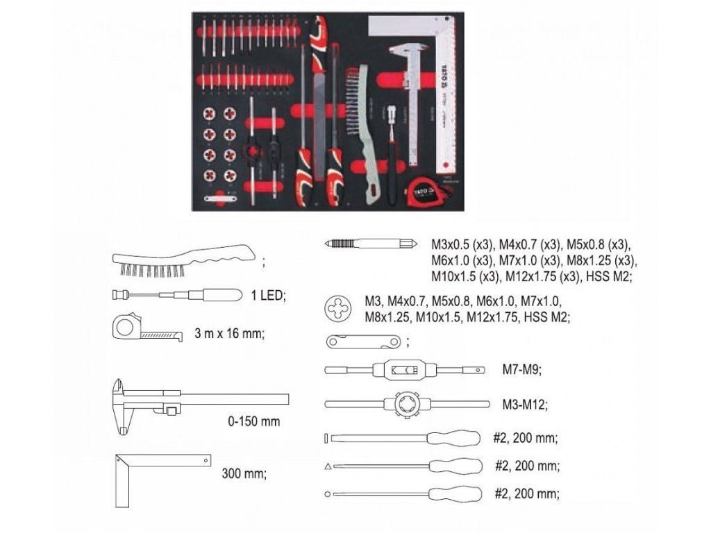 - Závitníky: M3x05 (x3), M4x0,7(x3), M5x0,8(x3), M6x1,0(x3), M7x1,0(x3), M8x1,25(x3), M10x1,5(x3), M12x1,75(x3); HSS M2