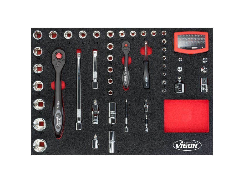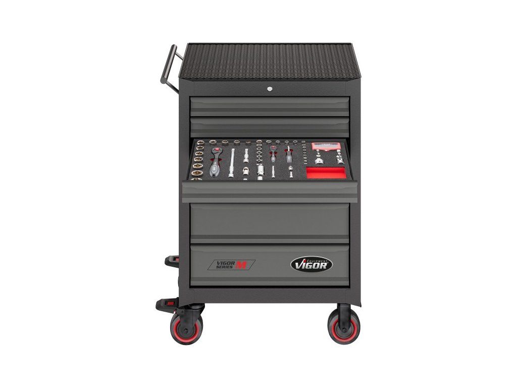 V zásuvkách jsou pěnové výplně dílenských vozíků s běžně používaným nářadím v profesionální kvalitě. V sadách nářadí naleznete golu 1/4", 1/2", 3/8", nástrčné klíče, sadu kleští, kladivo, IMBUSY, velkou sadu klíčů a mnoho dalšího.