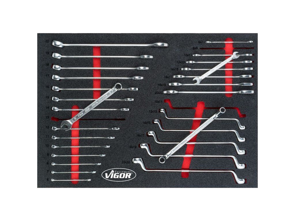 | 8 ks | Oboustranné ploché klíče: 6 x 7; 8 x 9; 10 x 11; 12 x 13; 14 x 15; 16 x 17; 18 x 19; 20 x 22 mm |