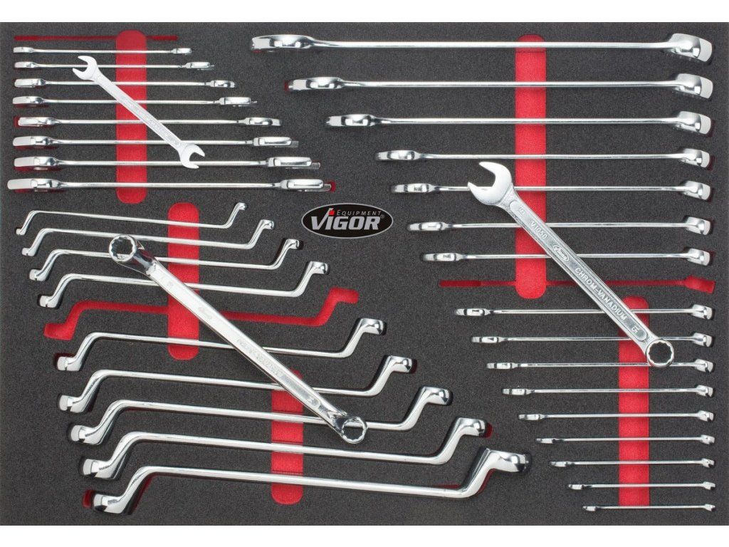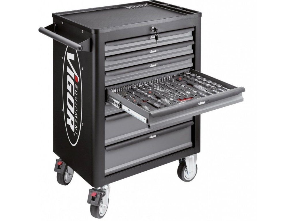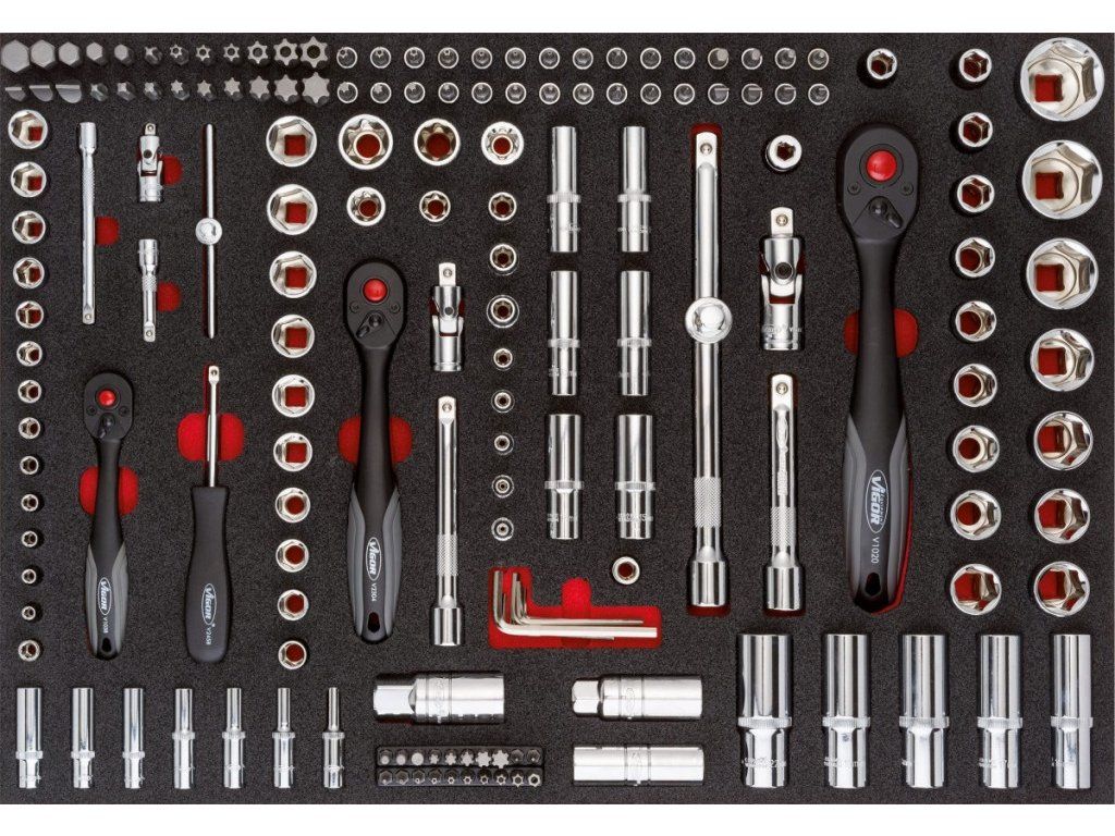 V 7 zásuvkách jsou pěnové výplně dílenských vozíků s běžně používaným nářadím v profesionální kvalitě. V sadách nářadí naleznete golu 1/4", 1/2", 3/8", nástrčné klíče, sadu kleští, kladivo, IMBUSY, velkou sadu klíčů a mnoho dalšího.