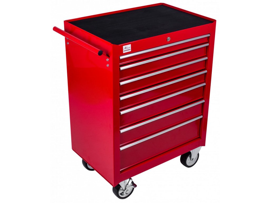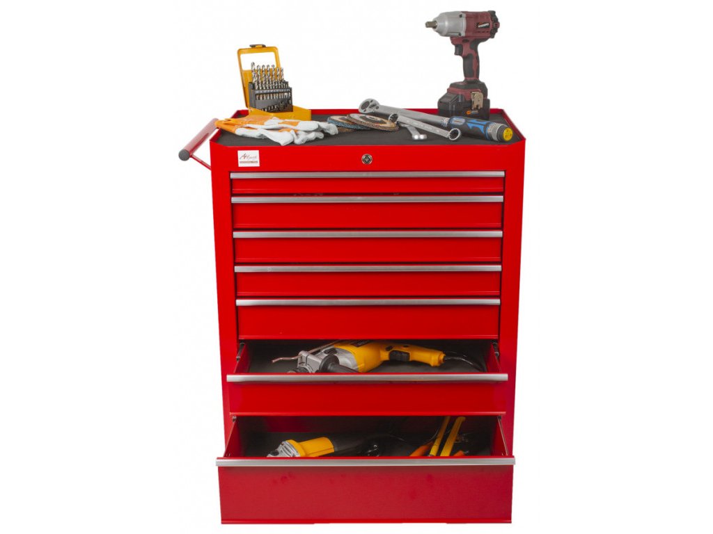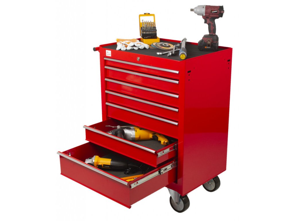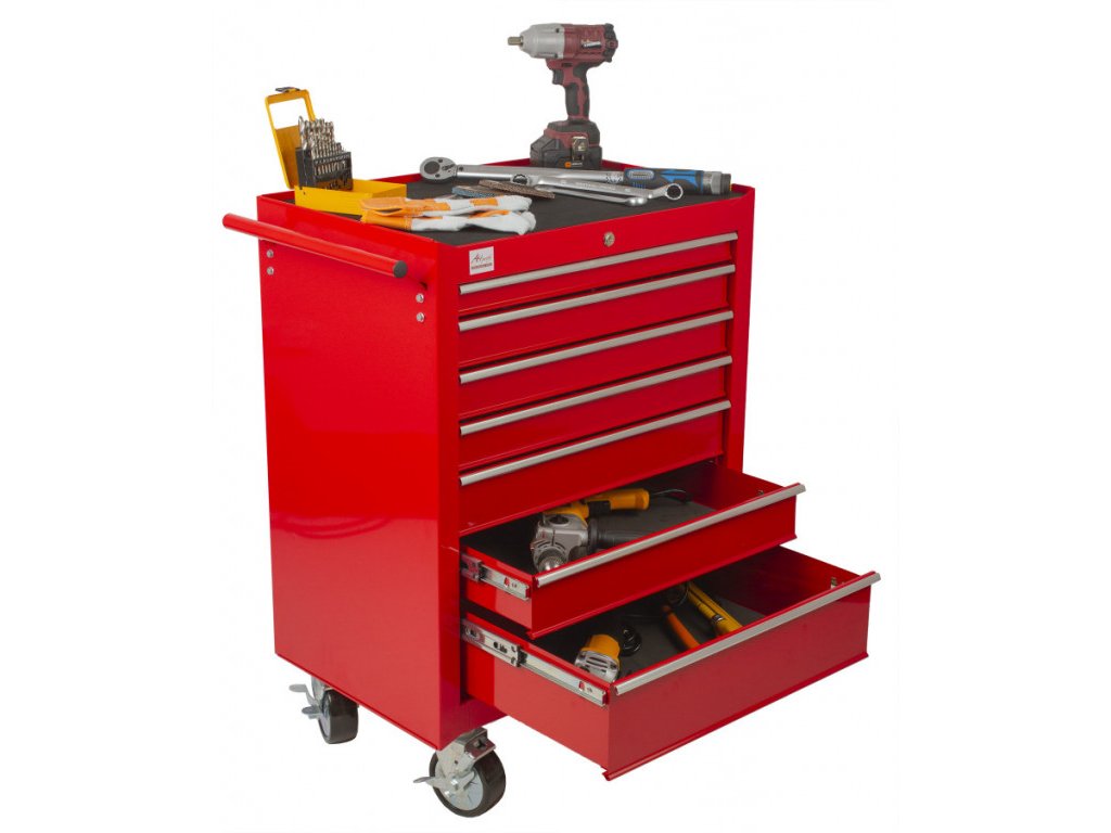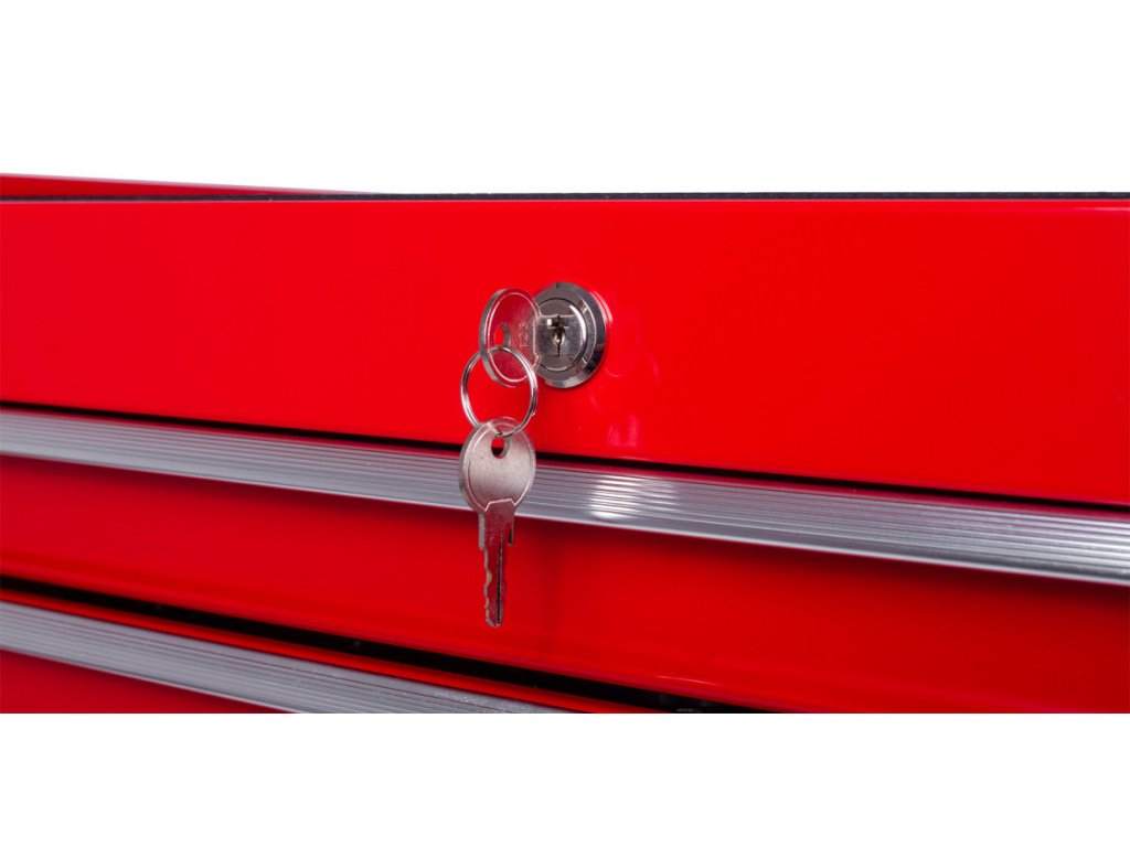 Červený dílenský vozík se 7-mi zásuvkami obsahuje 136 kusů nejpotřebnějšího nářadí pro běžné domácí a hobby používání.