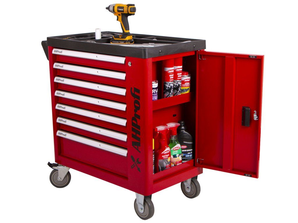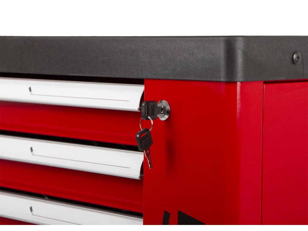 Červený kovový dílenský vozík se 7 šuplíky a boční skříňkou je vybavený 234 ks ručního nářadí, nezbytným pro práci v dílně.