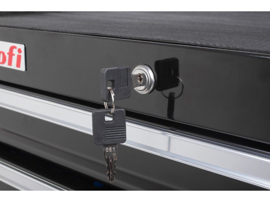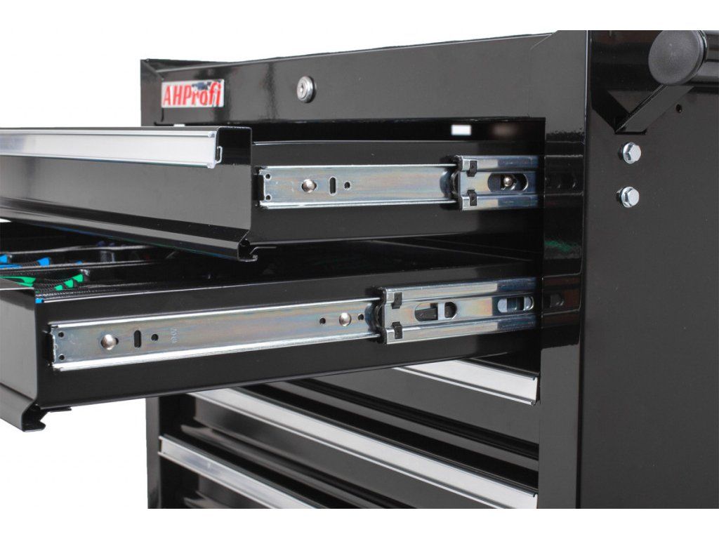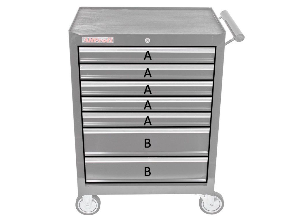 Horních 5 zásuvek je vybaveno výplněmi s nářadím. Spodní 2 vyšší zásuvky jsou prázdné.