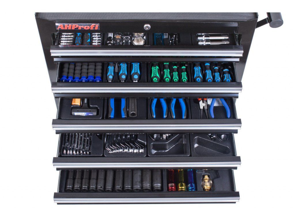 Černý dílenský vozík se 7-mi zásuvkami obsahuje 255 kusů nejpotřebnějšího nářadí od PROFI značky LICOTA. Rozměry vozíku s kolečky jsou: 770 x 460 x 1000 (š x h x v). Nářadí se nachází v 17-ti plastových výplní. V sadách nářadí naleznete golu 1/4", 3/8" i 1/2", nástrčné klíče, kleště, kladivo a paličku, šroubováky, IMBUSy, očkoploché klíče, momentový klíč, pneumatický utahovák, atd.