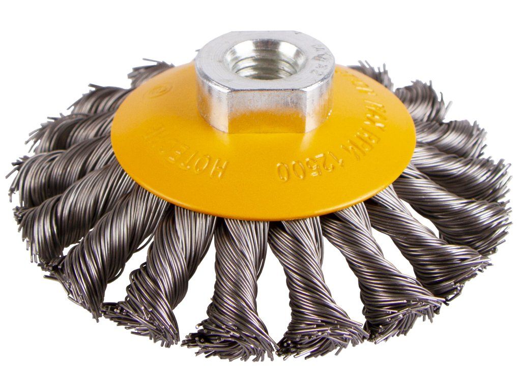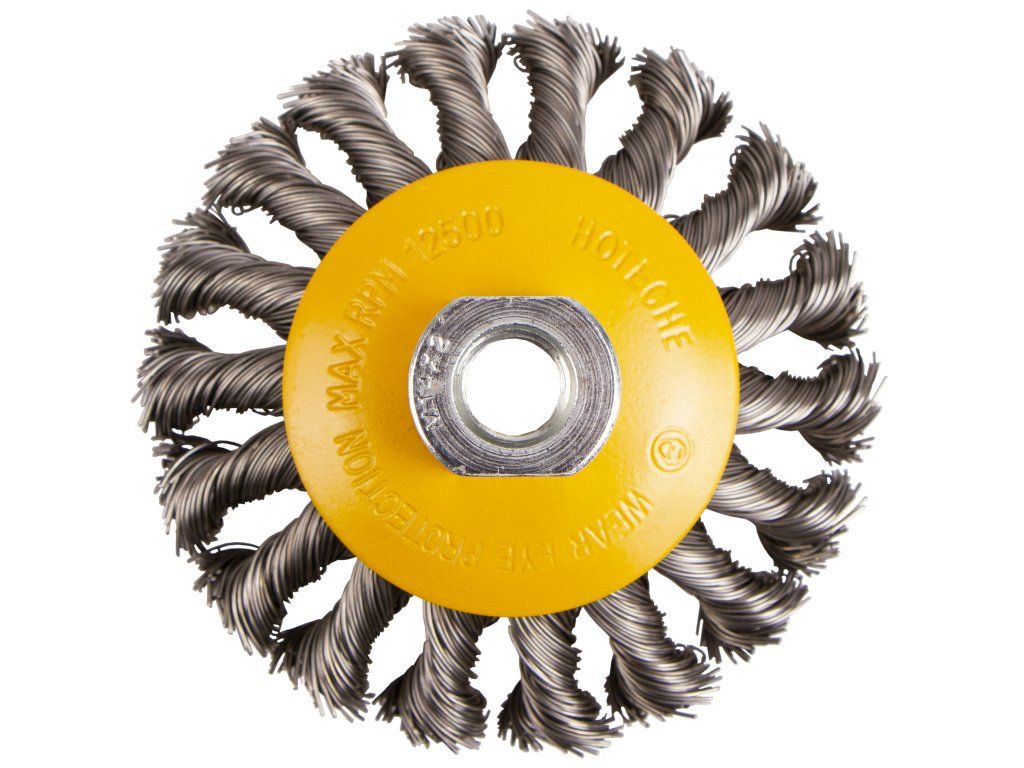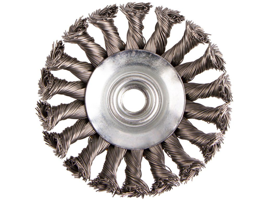 Drátěný boční kartáč o průměru 100 mm pro odstraňování rzi, barev a laků z kovových předmětů.