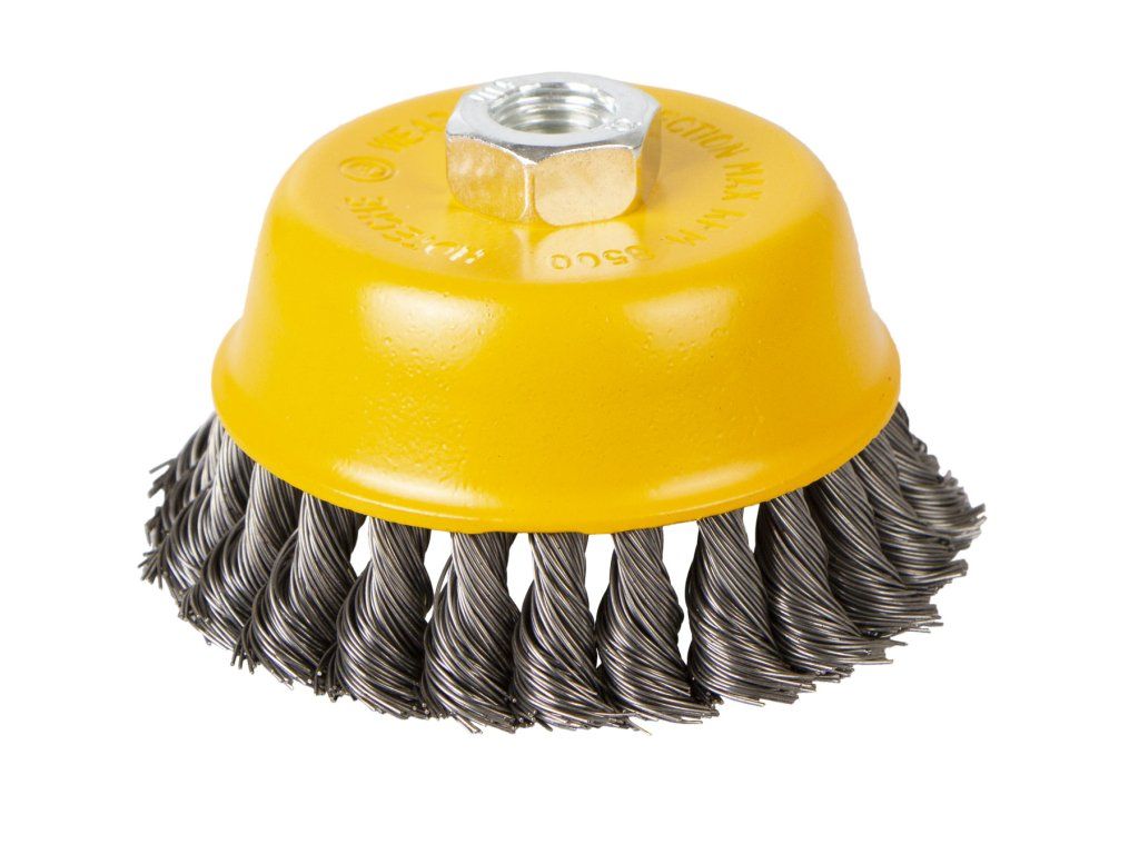 Drátěný čelní kartáč o průměru 100 mm pro odstraňování rzi, barev a laků z kovových předmětů.