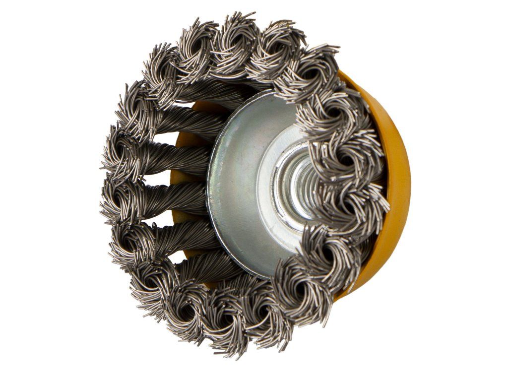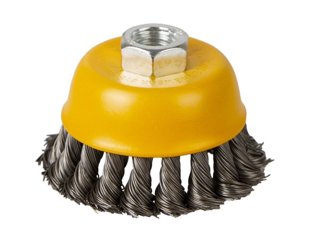Drátěný čelní kartáč o průměru 75 mm pro odstraňování rzi, barev a laků z kovových předmětů.