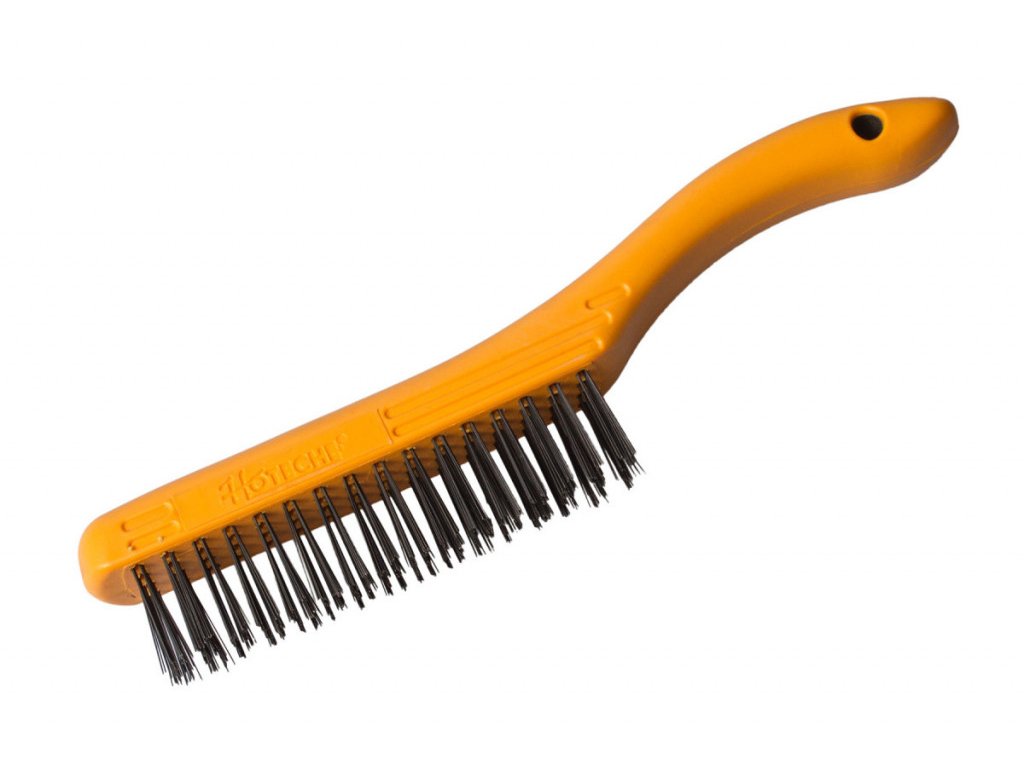 Zahnutý drátěný kartáč vyrobený značkou Hoteche je vhodný na odstranění hrubých nečistot z kovů a jiných odolných materiálů. Ruční kartáč je osazen řadou ocelových štětin. Kartáč doporučujeme využívat i na těžko přístupných místech.