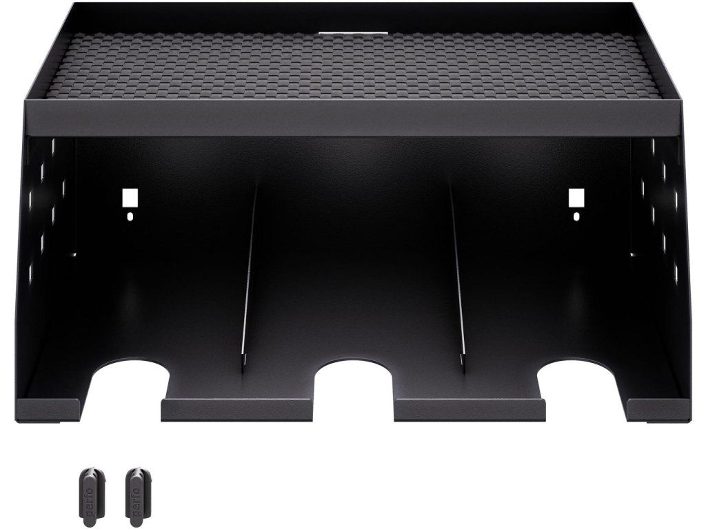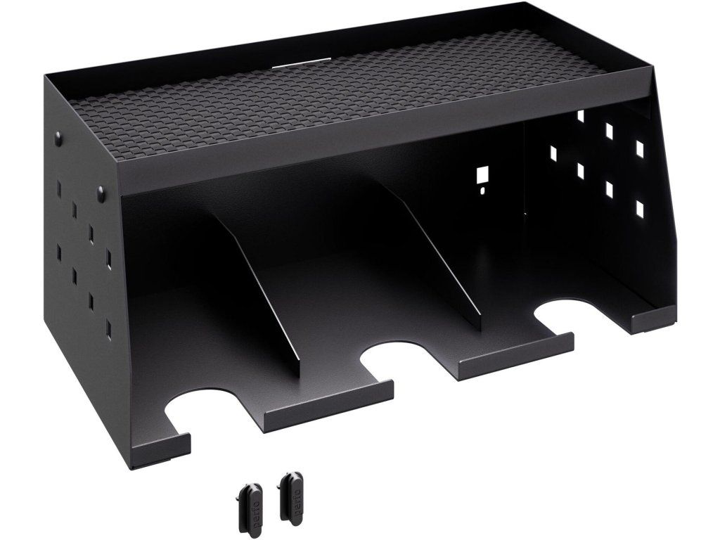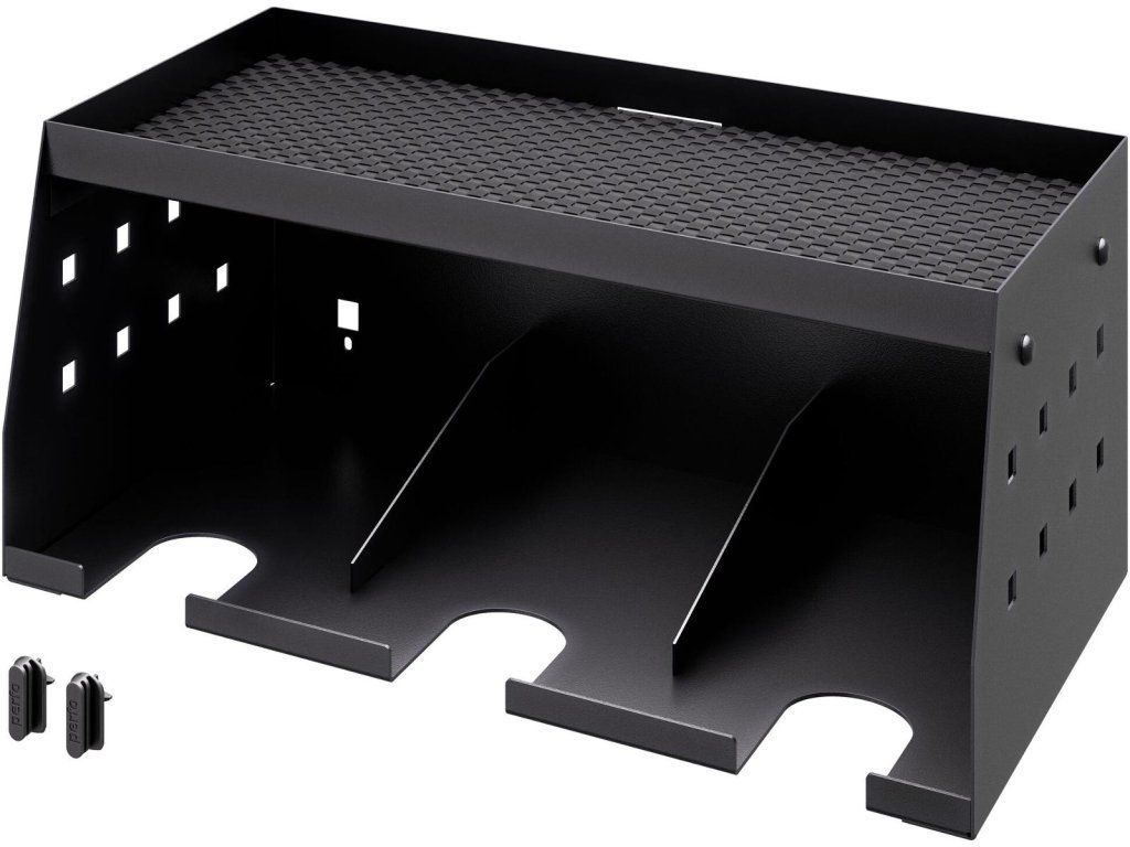 Horní odkládací plocha poskytuje dostatek místa pro nabíječky a další akumulátory, zatímco spodní výřezy umožňují zavěšení až 3 aku vrtaček nebo šroubováků.