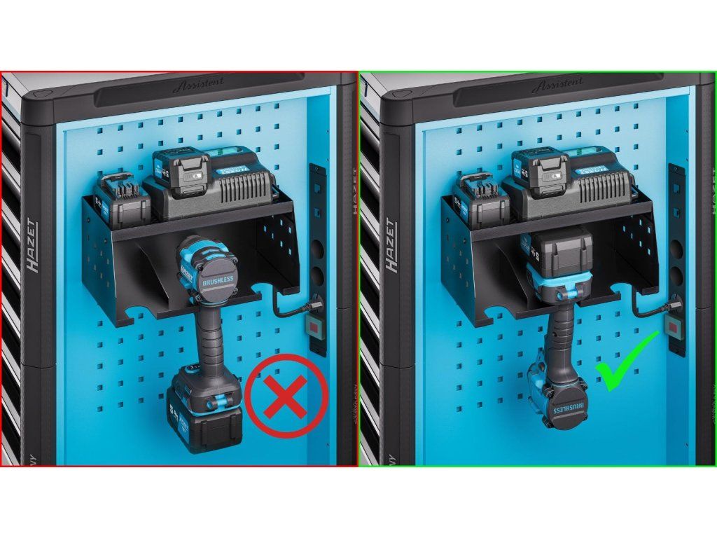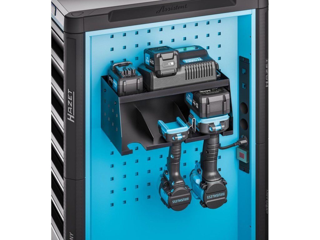 Praktický držák pro 3 aku přístroje, určený pro přehledné a bezpečné uložení akumulátorového nářadí v dílnách a servisech. Vhodný pro montáž na boční panely dílenských vozíků Hazet a pracovní stoly řady Assistent.