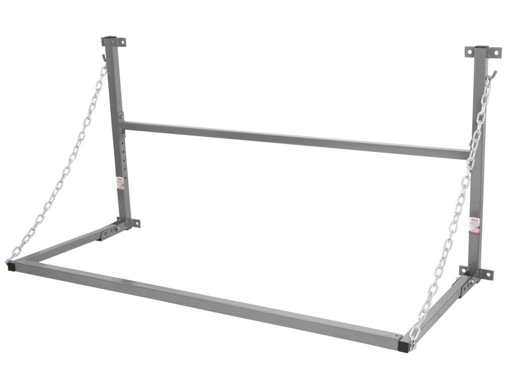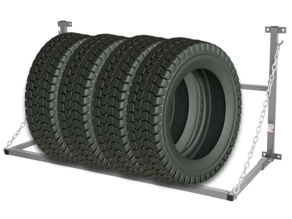 Celokovový závěsný držák pro bezpečné a pohodlné uskladnění pneumatik nebo kol.