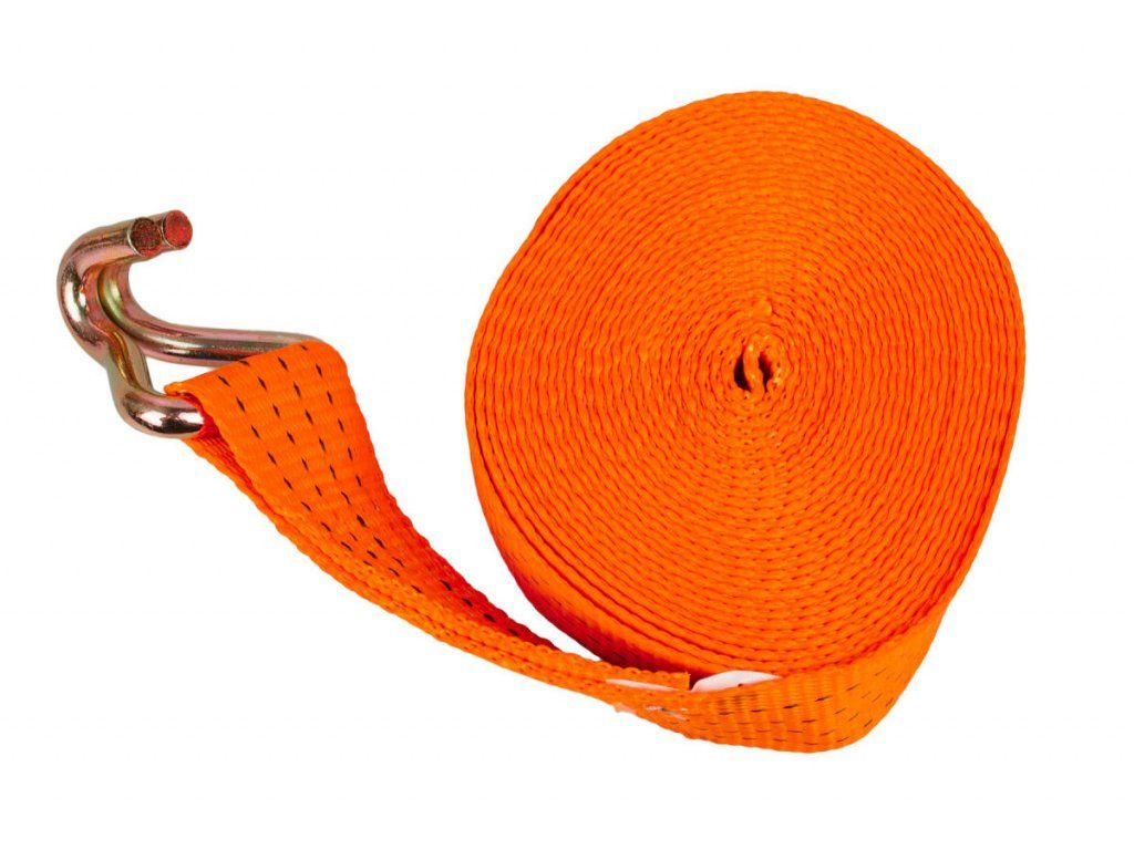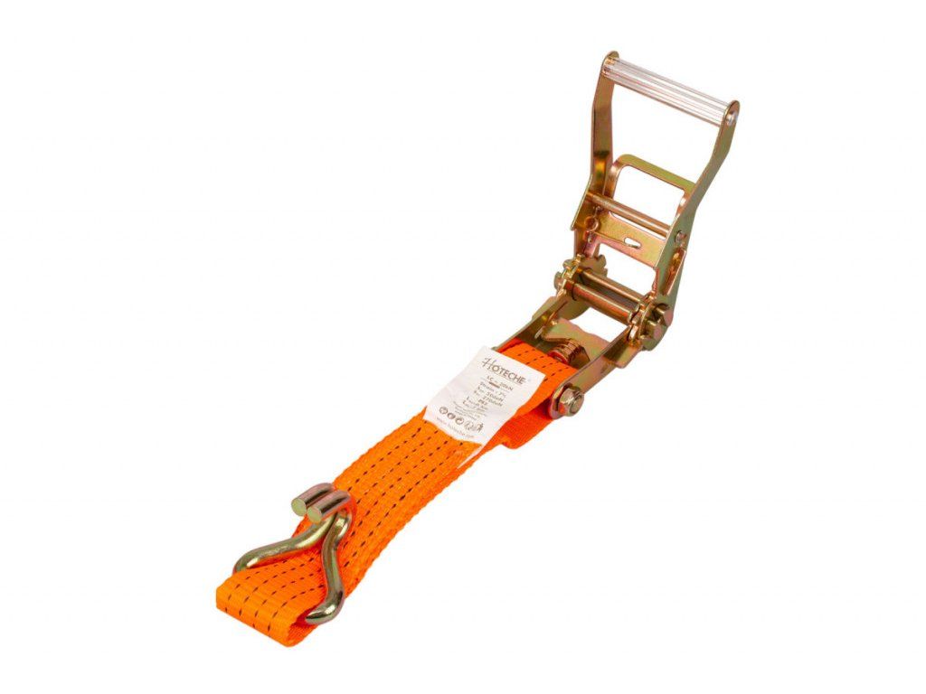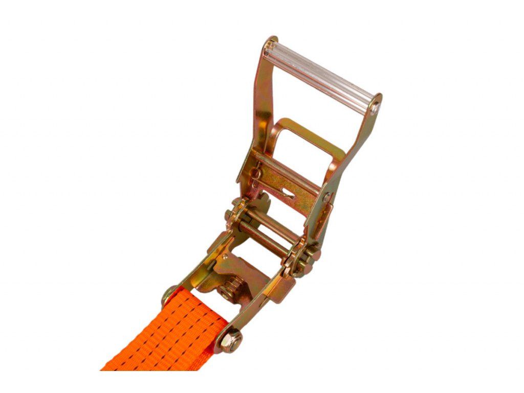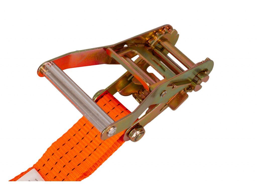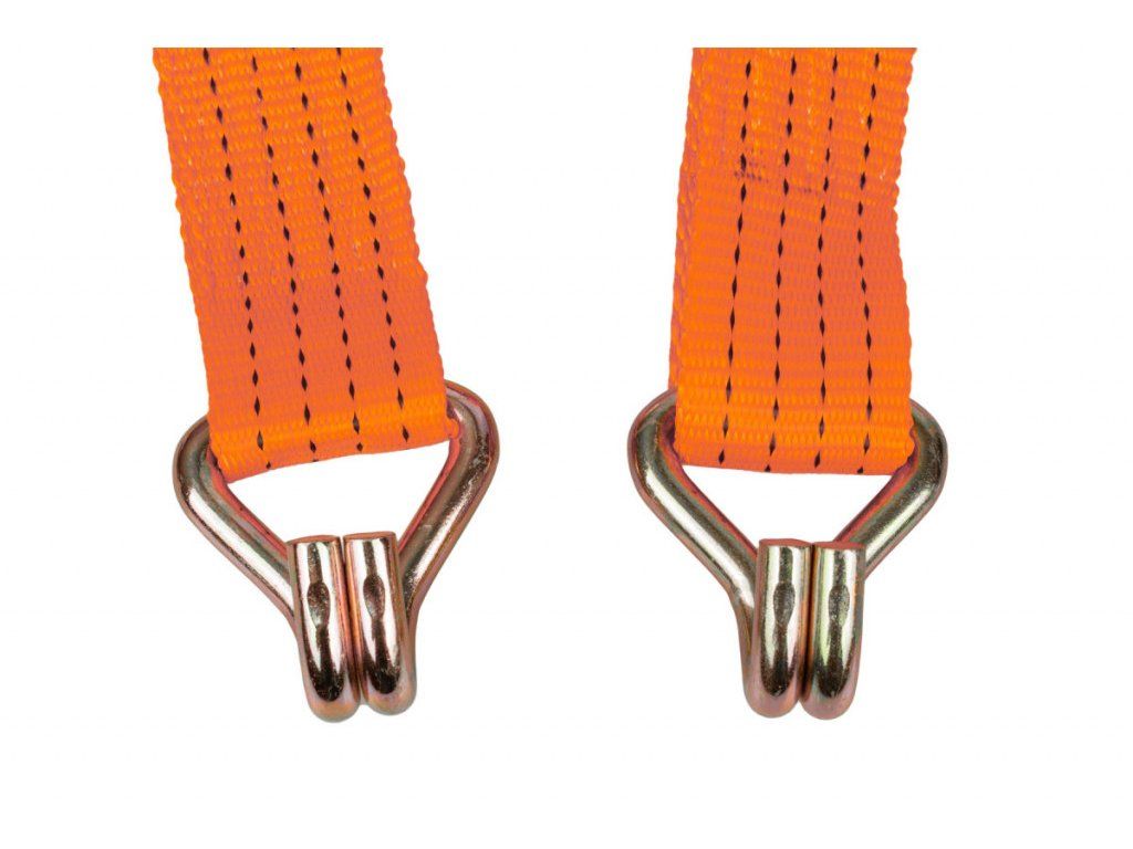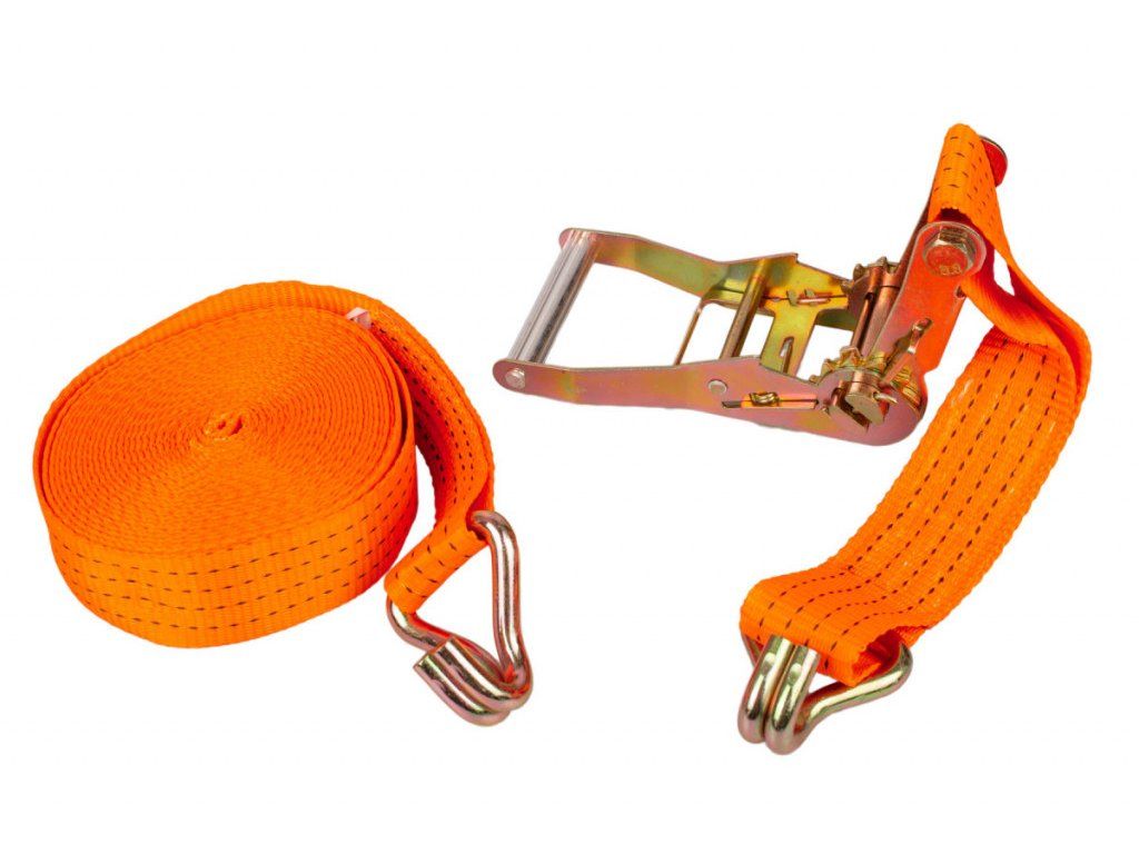 Dvoudílný upínací popruh o celkové délce 10 m, šířky 50 mm. Dlouhý Polyesterový pás je zakončený dvojitým J hákem a zapošitý. Druhý je osazený dvojitým J hákem a ráčnou. Všechny kovové prvky jsou pozinkované.