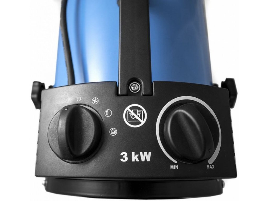 2 topné stupně. Průtok vzduchu: 280 m3/hod. Max. topný výkon: 3 kW. Jmenovitý proud: 8,7 A.