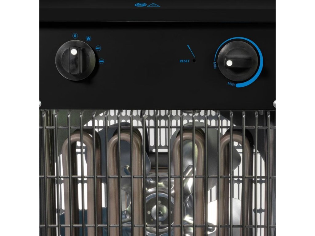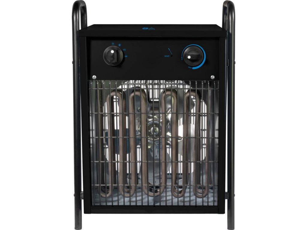 Max. topný výkon: 9 kW (→ 7.740 kcal/hod., 2 topné stupně: 4,5 kW/9 kW), prostorový termostat (→ automatické zapínání/vypínání topné spirály po dosažení nastavené teploty), ventilátor.