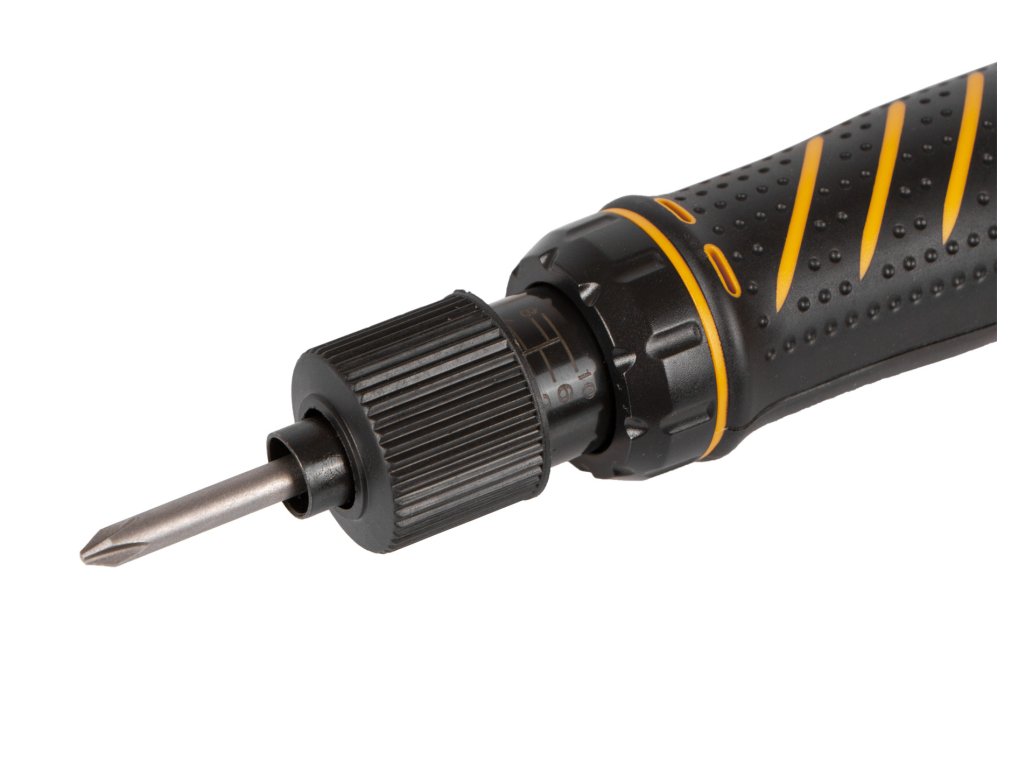 Šroubovák pracuje s utahovacím momentem 0,3 - 2,8 Nm, který lze nastavit v 10-ti stupních pomocí otočného mechanismu.