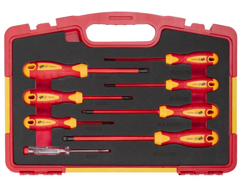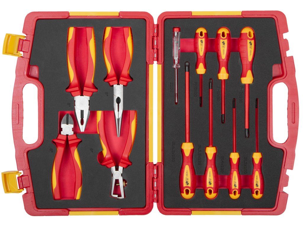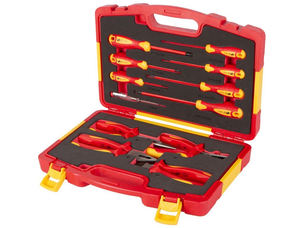 Sada VDE izolovaného nářadí obsahuje 12 kusů profesionálního nářadí, které splňuje přísné normy VDE a GS.