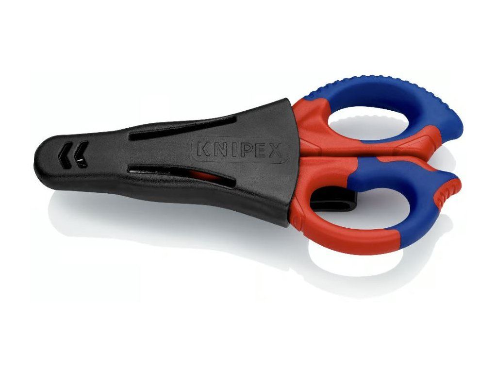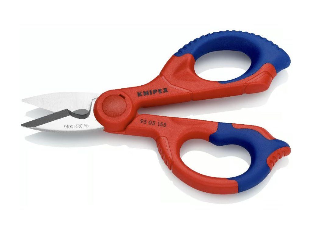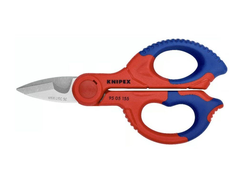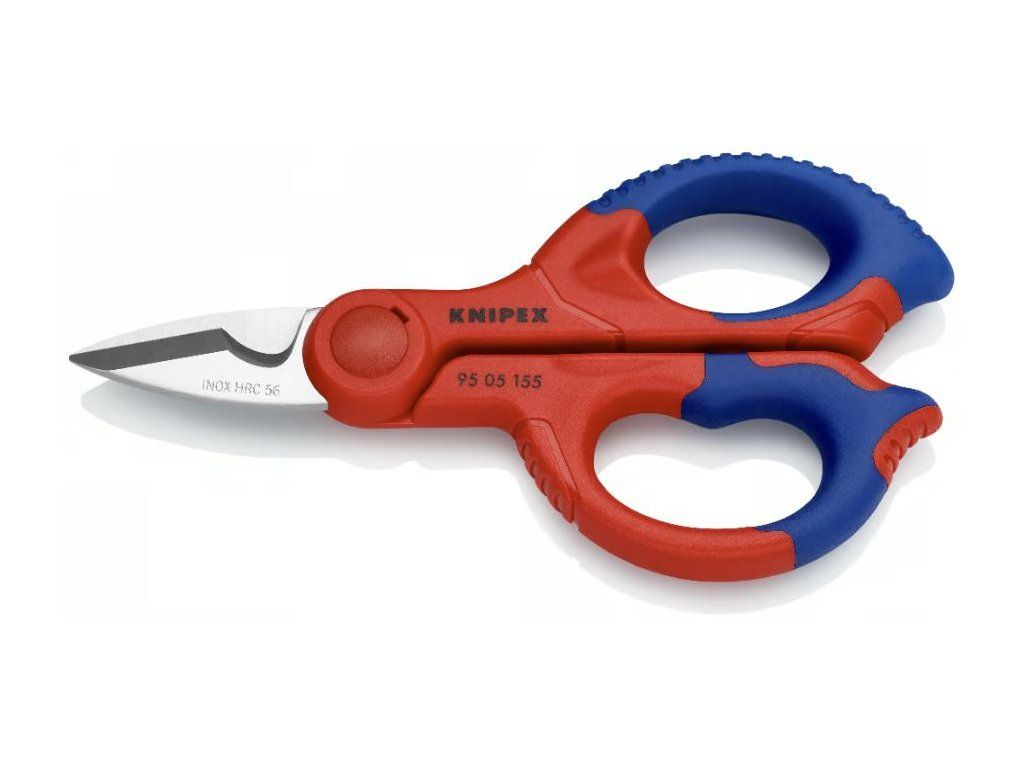Univerzální elektrikářské nůžky Knipex, délka 155 mm. Mikrozuby pro čistý řez, břity z nerezové oceli, tvrdost 56 HRC. Ergonomické rukojeti, oddělovač kabelů, ledvinka pro bezpečné uložení.