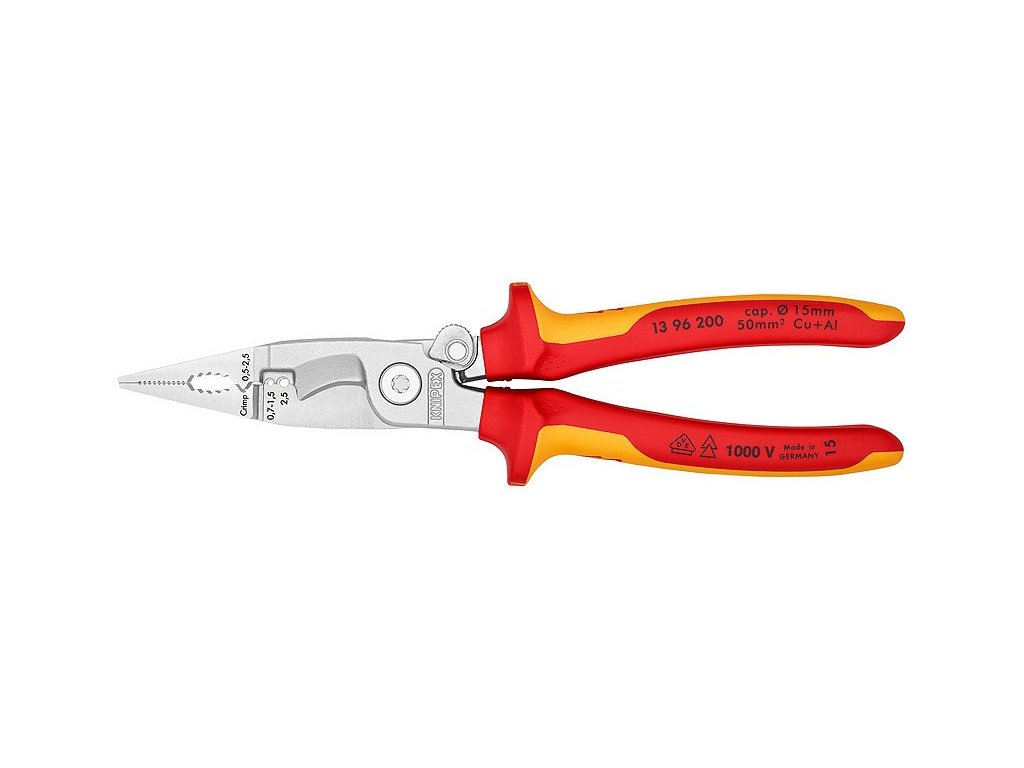 Multifunkční kleště pro elektroinstalace- na uchopování plochého i kulatého materiálu, ohýbání, odstranění otřepu, štípání kabelů, odizolování a krimpování koncových dutinek. 6 funkcí v jedněch kleštích. Hladké úchopové plochy na hrotu pro uchopování jednotlivých vodičů bez poškození- profilované úchopové plochy a hořákový otvor pro uchopování plochého i kulatého materiálu. Výrazná vnější hrana na čelisti pro úpravu podomítkových zásuvek a odstraňování otřepu u průchodových otvorů. Otvory pro odizolování na vodiče 0,75-1,5 mm? a 2,5 mm?. Krimpovací hnízdo na koncové dutinky 0,5-2,5 mm?. Kabelové nůžky s přesnými břity (indukčně kalené) na měděné a hliníkové kabely do 5 x 2,5 mm? / ? 15 mm. Uchopení bez úplného rozevírání kleští (inteligentní přídržný mechanismus u verze s otevírací pružinou) Břit zůstane uzavřený a chráněný.. štíhlá konstrukce kvůli lepší přístupnosti. šroubovaný kloub: Přesný chod kleští bez vůle. S inteligentním přídržným mechanismem lze věc „uchopit“ bez rozevírání kleští. Břit zůstane uzavřený a chráněný.. U modelů s pružinou pro rozevření integrovanou v kloubu drží aktivovaná blokovací západka břity uzavřené, zatímco ostatní funkce zůstávají zachovány.
