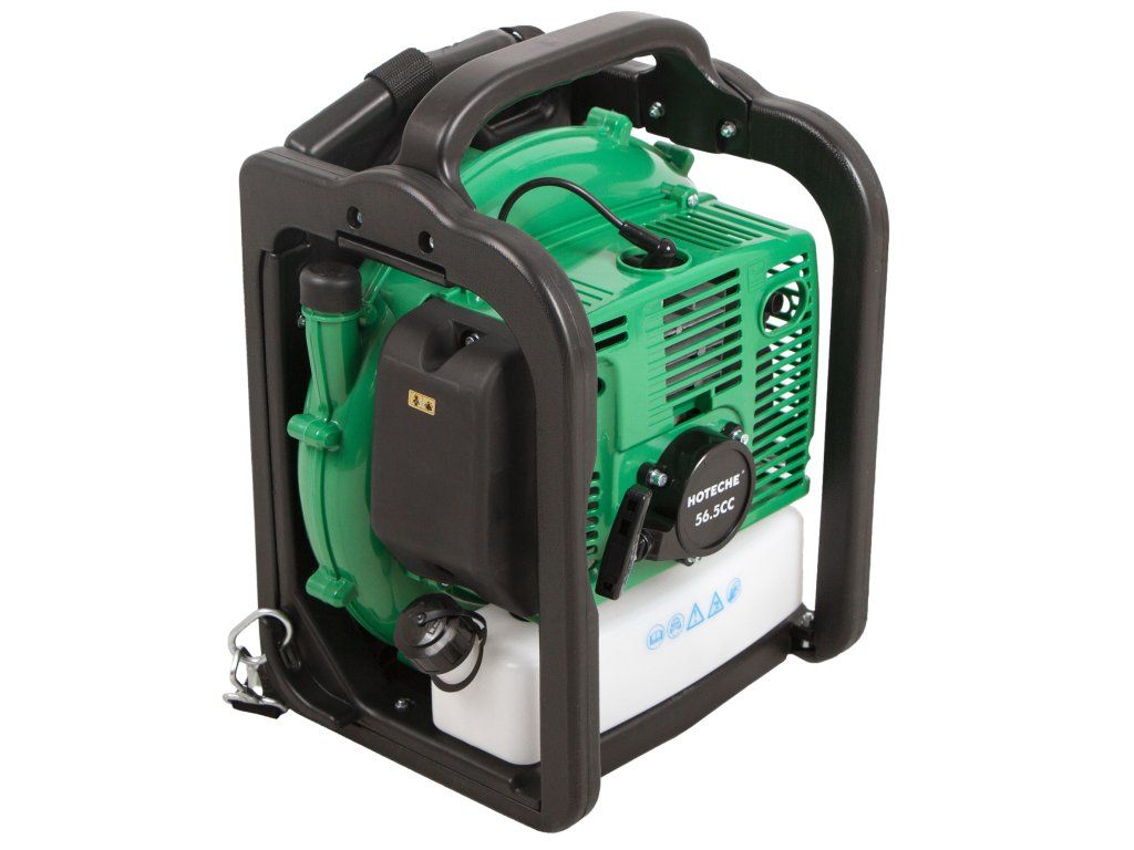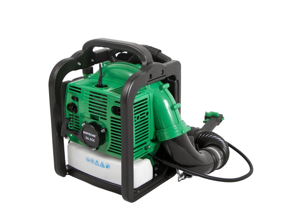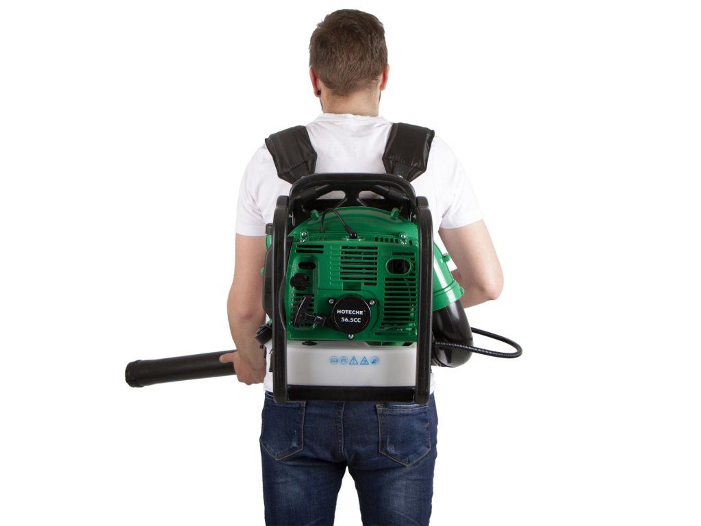 Benzínový fukar na listí od značky Hoteche poháněný dvoutaktním motorem o objemu 56,5 cm3.