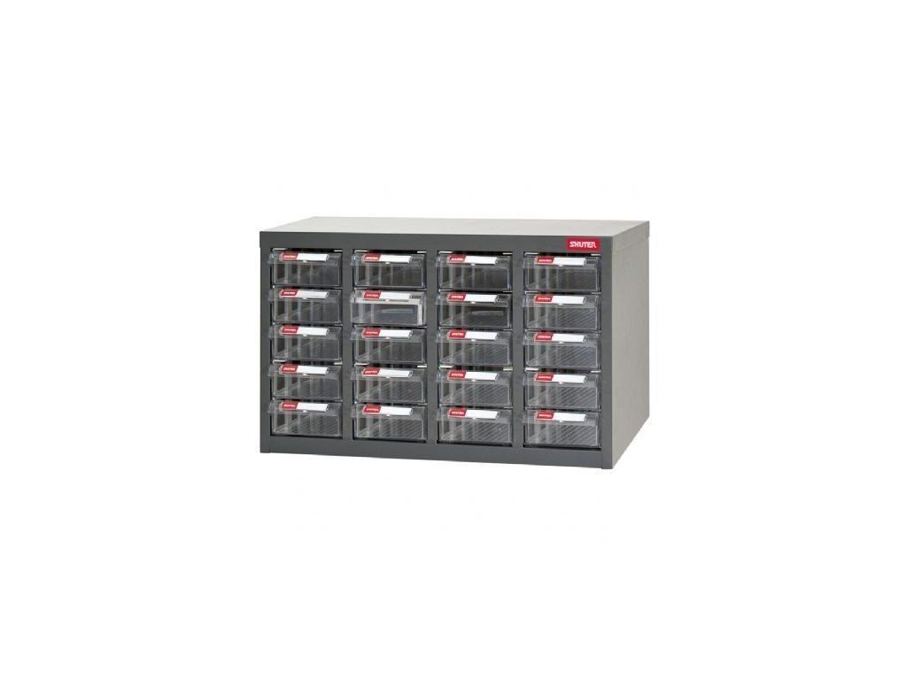 Galvanizovaný pořadač montážního materiálu a nářadí s celkem 20 průhlednými plastovými zásuvkami, každá o rozměrech (Š x V x H) 120 x 55 x 248 mm.