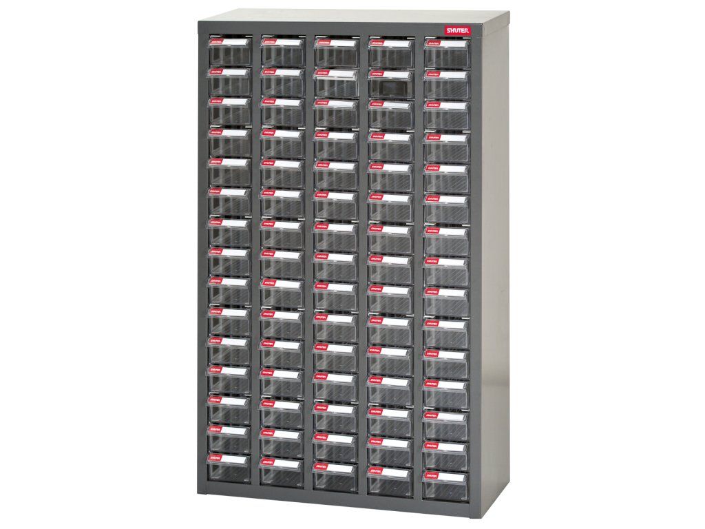 Galvanizovaný pořadač montážního materiálu a nářadí s celkem 75 průhlednými plastovými zásuvkami, každá o rozměrech (Š x V x H) 90 x 55 x 218 mm.