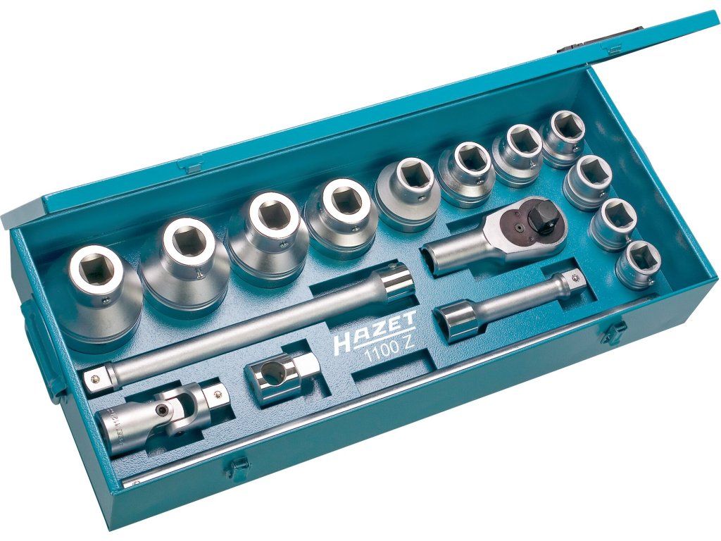 Kvalitní sada nástrčných klíčů 1", německý výrobce HAZET, 17 kusů v kovovém pouzdře, obsahuje 11 nástrčných klíčů, ráčnu, trhák a 3 adaptéry.