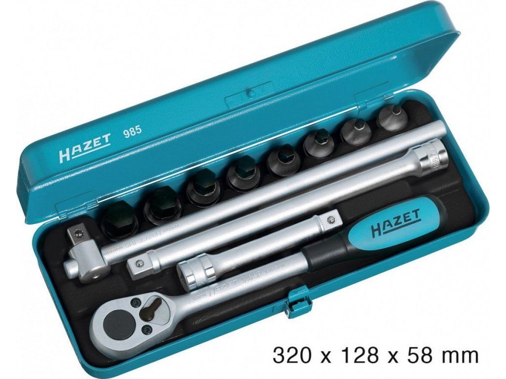 Sada nástrčných klíčů 1/2" od kvalitního výrobce HAZET (Německo), 12 dílů v kovovém kufříku, obsahuje ořechy 5-19 mm, ráčnu, vratidlo a adaptéry.