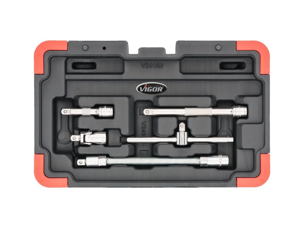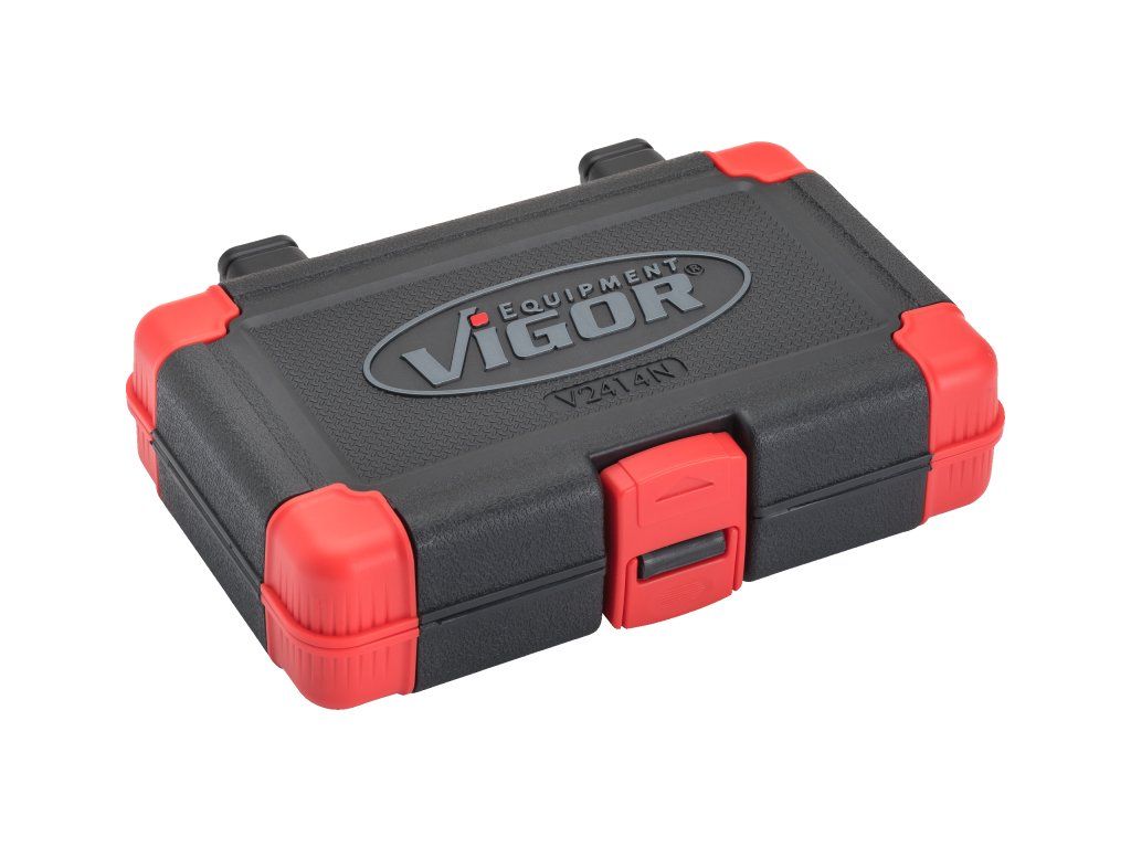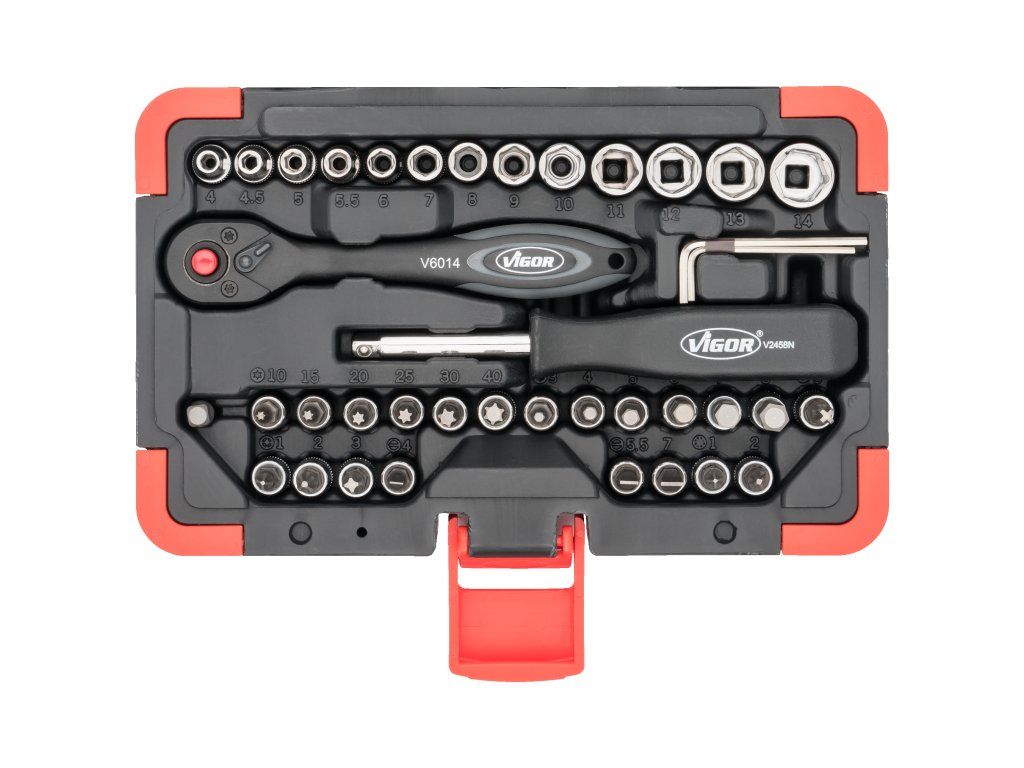 Sada 46 nástrčných klíčů a hlavic 1/4" od kvalitní německé značky VIGOR, chrom-vanadium, dodáváno v plastové krabičce o rozměru 225 x 134 x 60 mm.