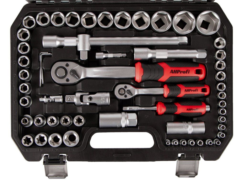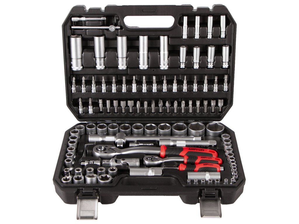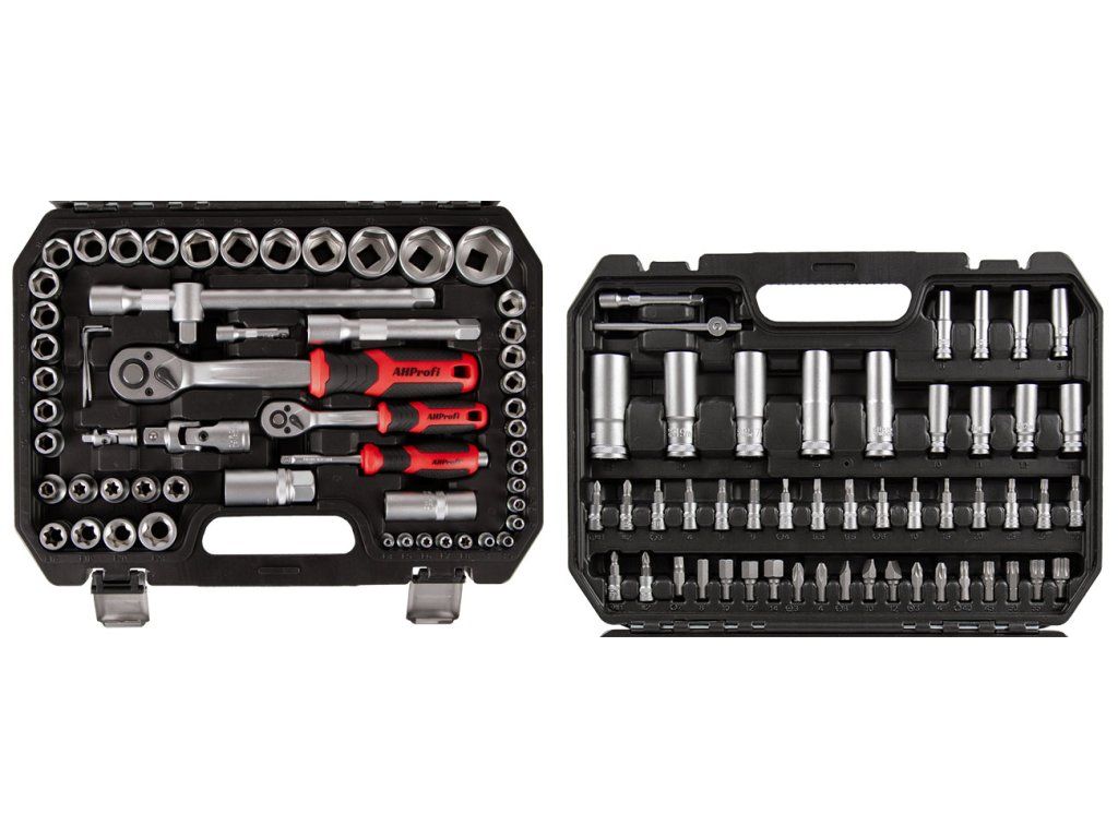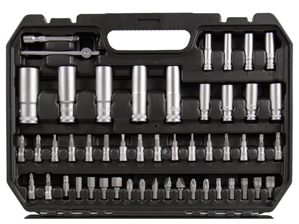 - Komplexní obsah včetně ráčen, nástrčných klíčů, nástavců, bitů aj.