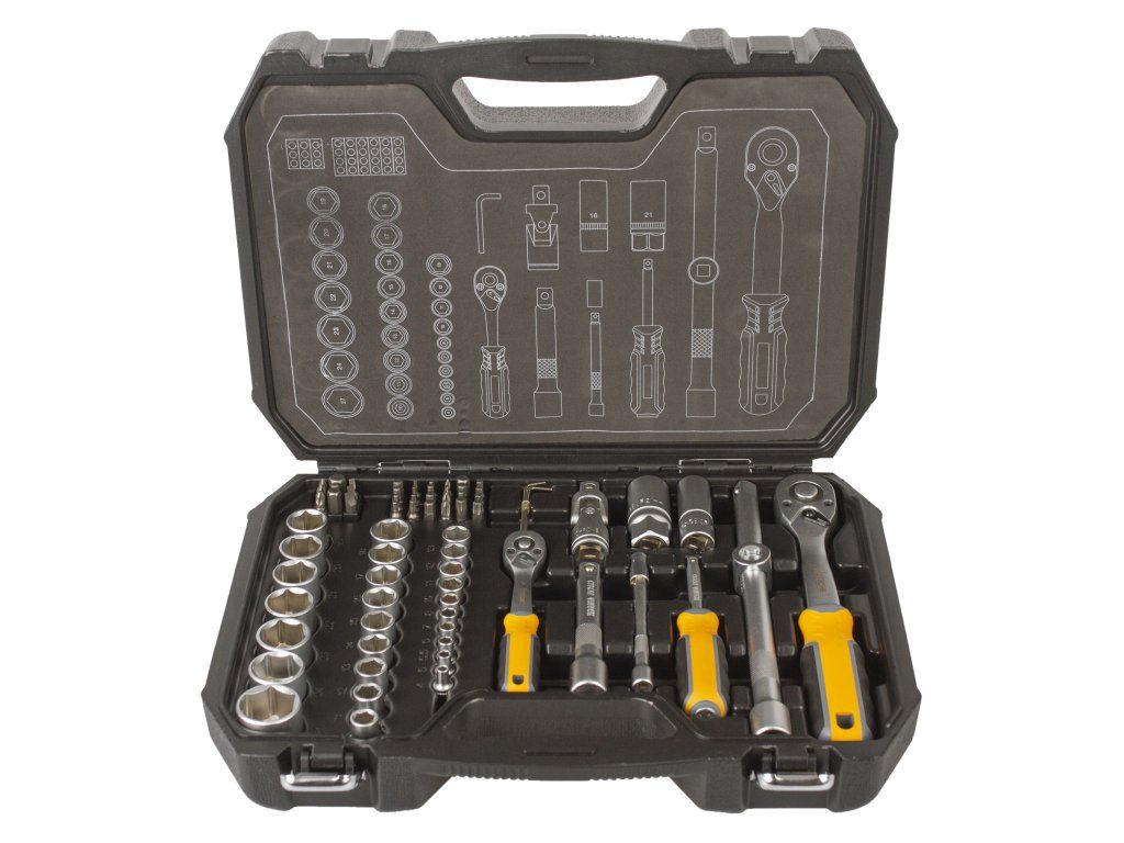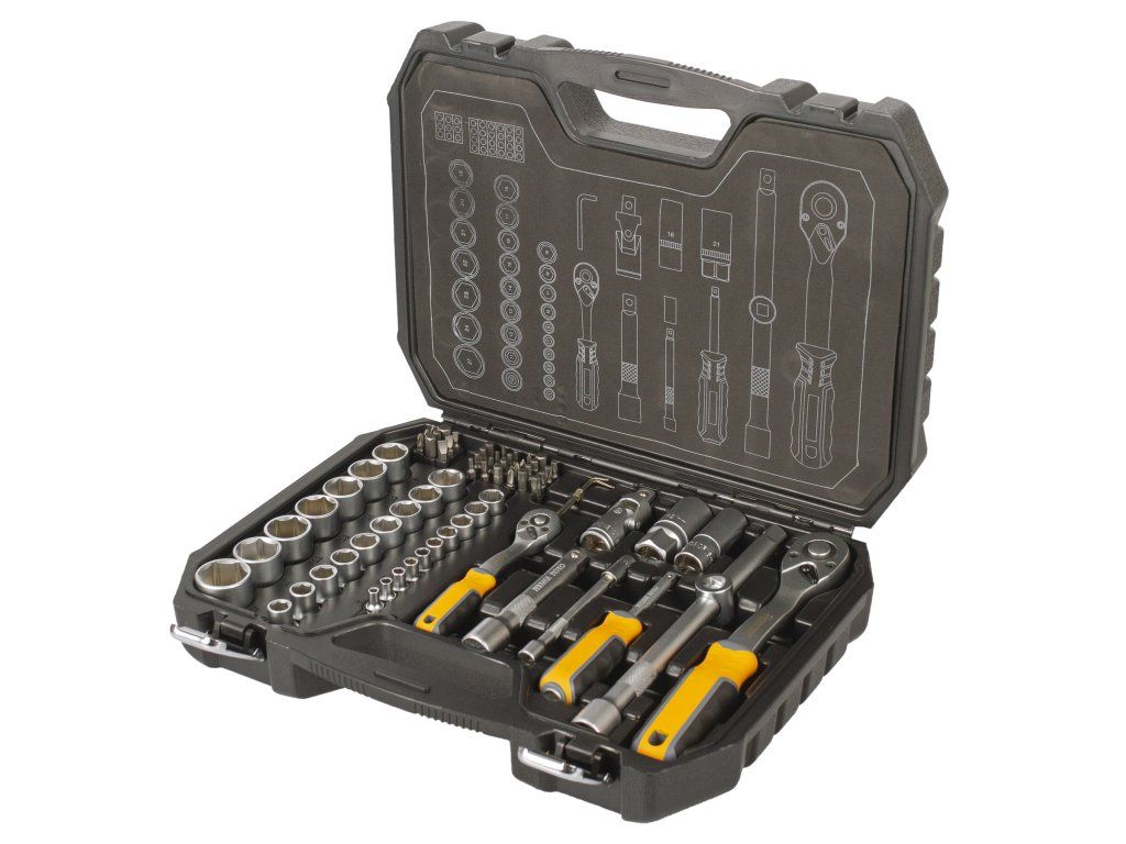Gola sada 1/4" a 1/2" v praktickém plastovém kufříku, díky kterému sadu snadno přenesete. Díky ergonomickému tvaru rukojeti padnou ráčny se šroubovákem dobře do ruky a docílíte tak pevnějšího úchopu. Rukojeť je navíc vyrobena z protiskluzových materiálů (kombinace plastu a gumy).