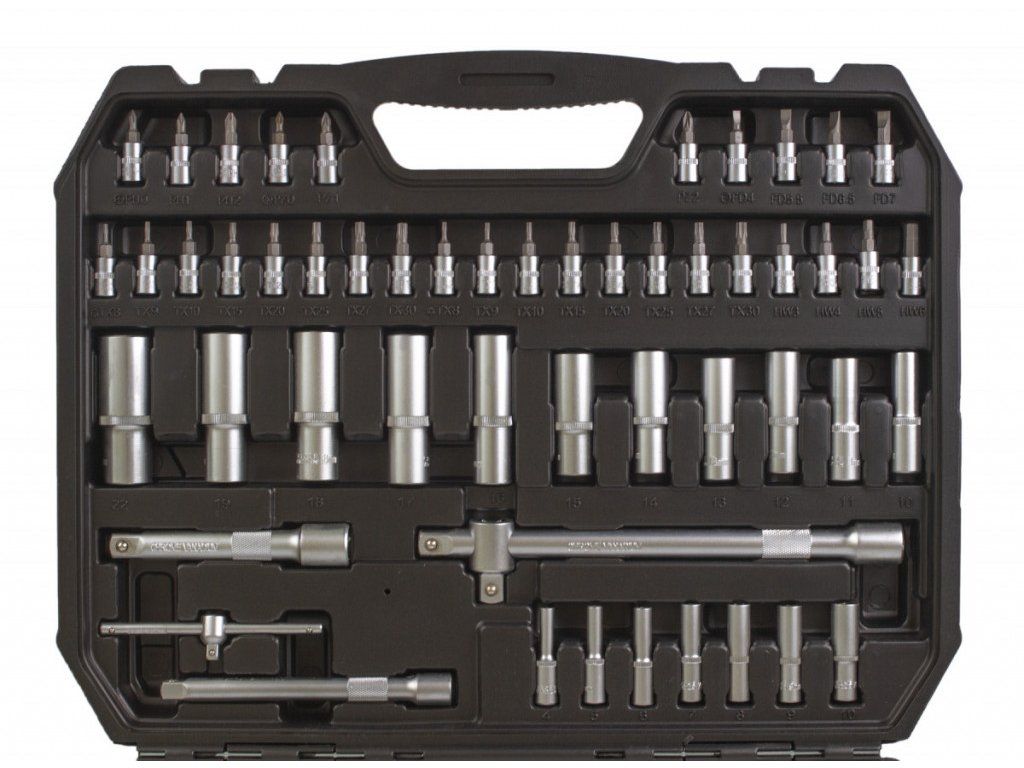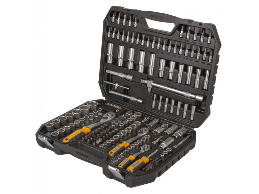 Sada obsahuje ráčny 1/4", 3/8" a 1/2", nástrčné klíče, prodloužení, kardanové klouby, sady bitů a mnoho dalšího.
