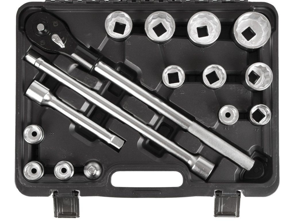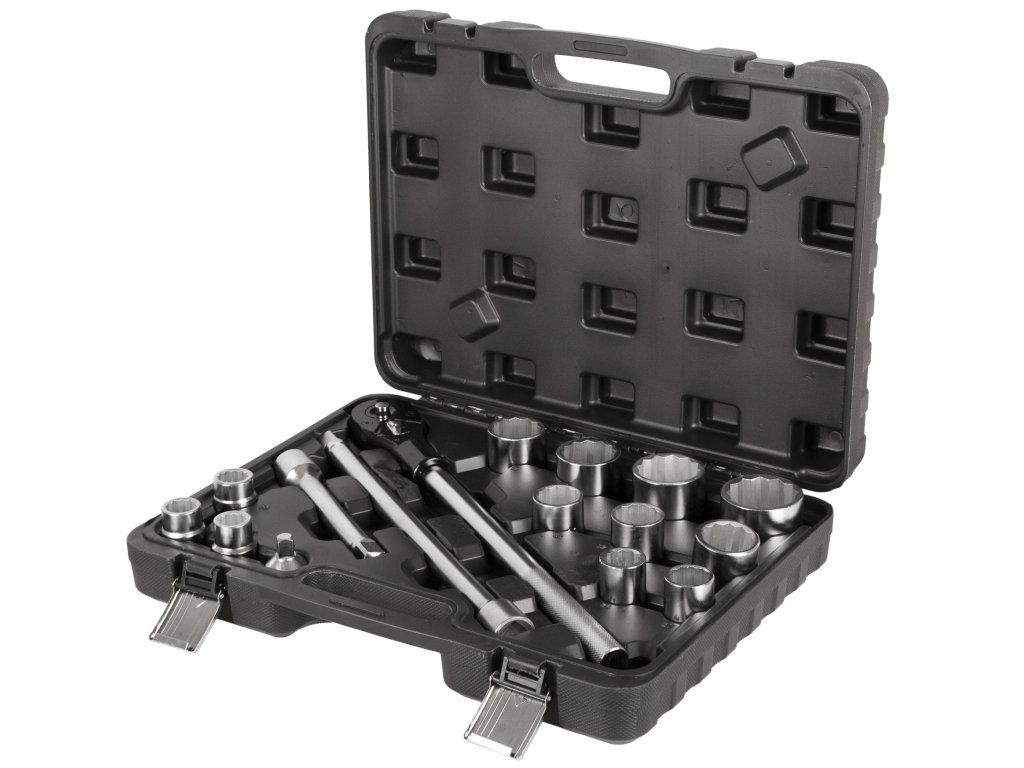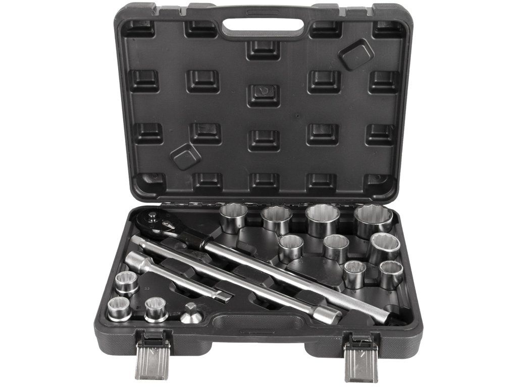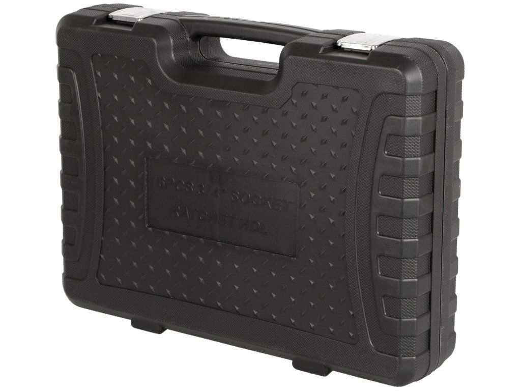 Gola sada 3/4" složená ze 16 dílů. Sada obsahuje ráčnu, ořechy a prodloužení. Nářadí je vyrobeno z Cr-V a je uloženo v plastovém kurfu.