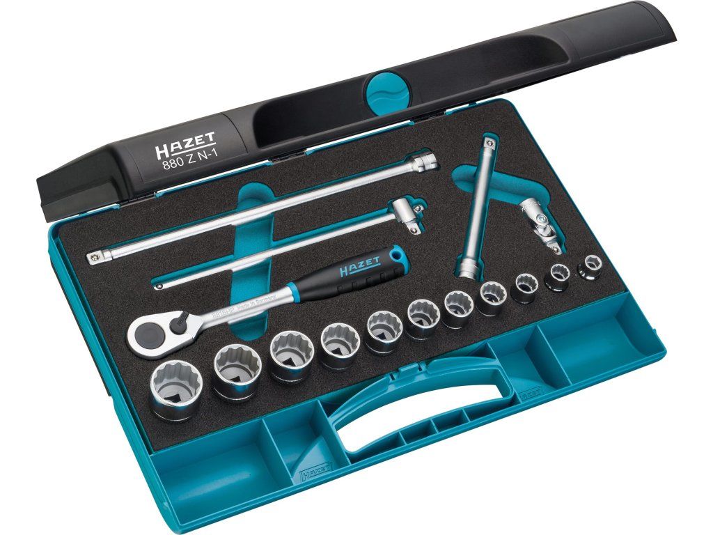 Gola sada od kvalitního německého výrobce HAZET, 3/8", 16 kusů v plastovém kufříku, obsahuje 12hranné ořechy 10-22 mm, ráčnu, adaptéry a T-vratidlo.