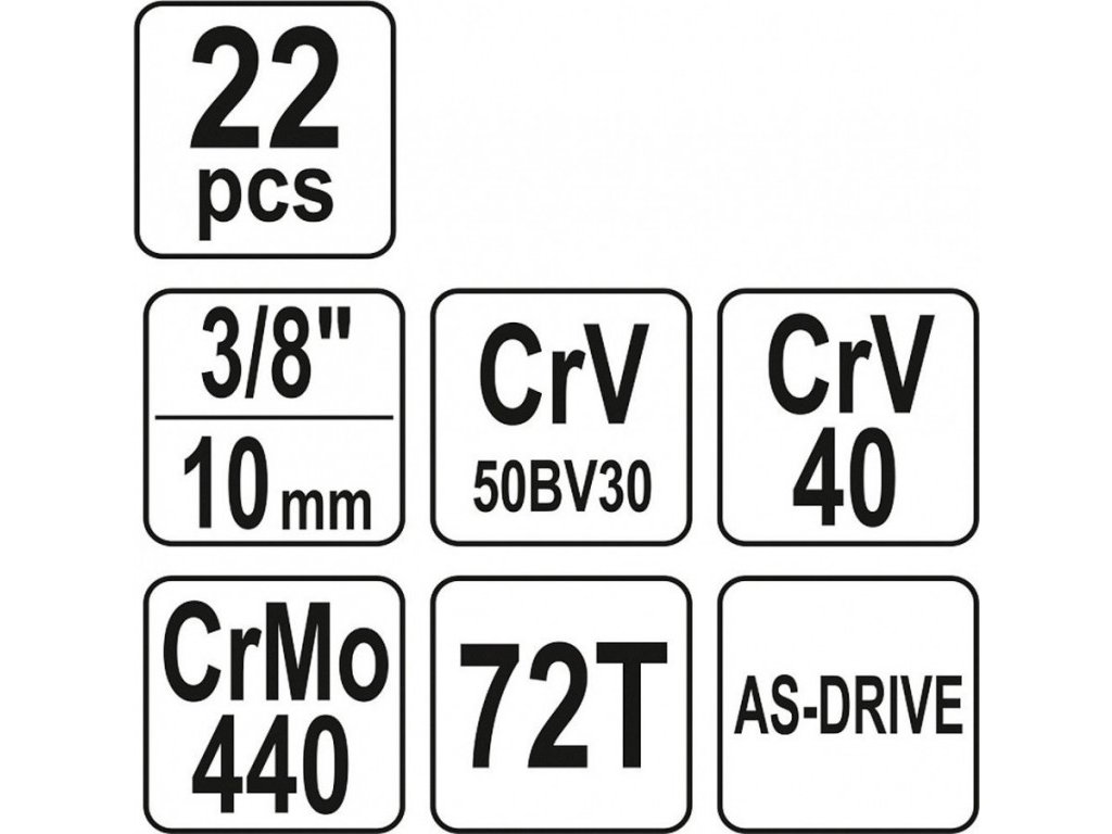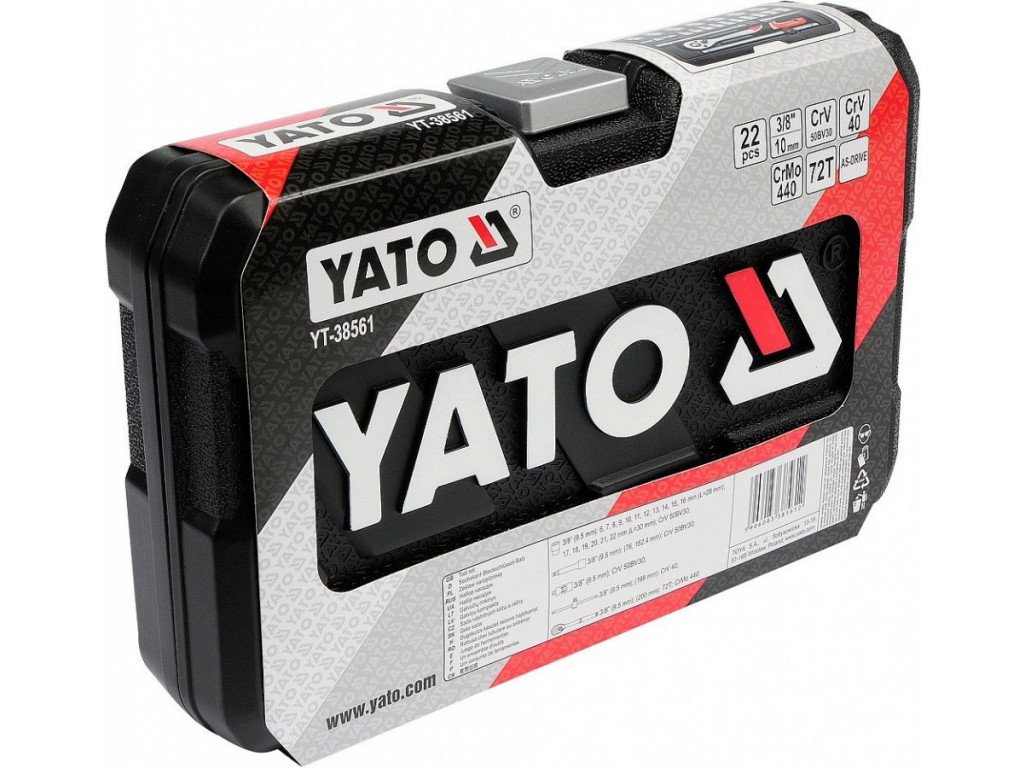 Sada nástrčných klíčů YATO, 22 kusů v plastovém kufříku, obsahuje ořechy 3/8" 6-22 mm, ráčnu, nástavce, T vratidlo a kardanový kloub.